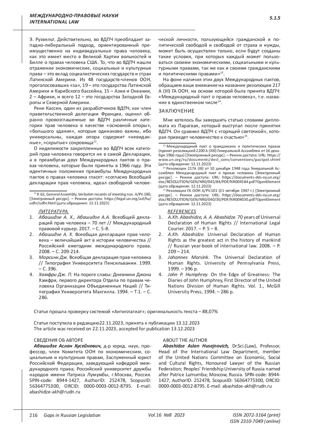 A.Kh. Abashidze. Universal Declaration of Human Rights as the greatest act in the history of mankind // Russian year-book of international law. 2008. - P. 209 - 214.