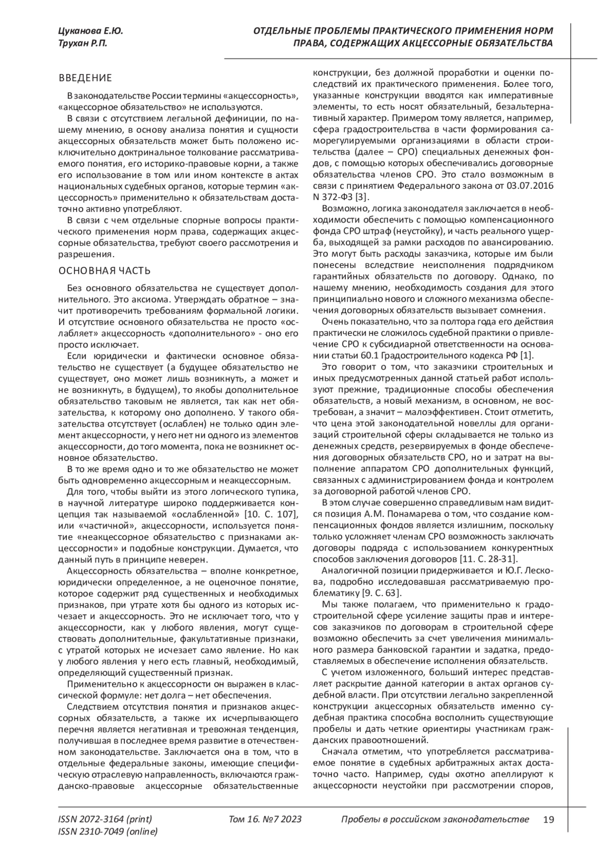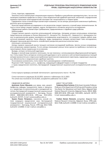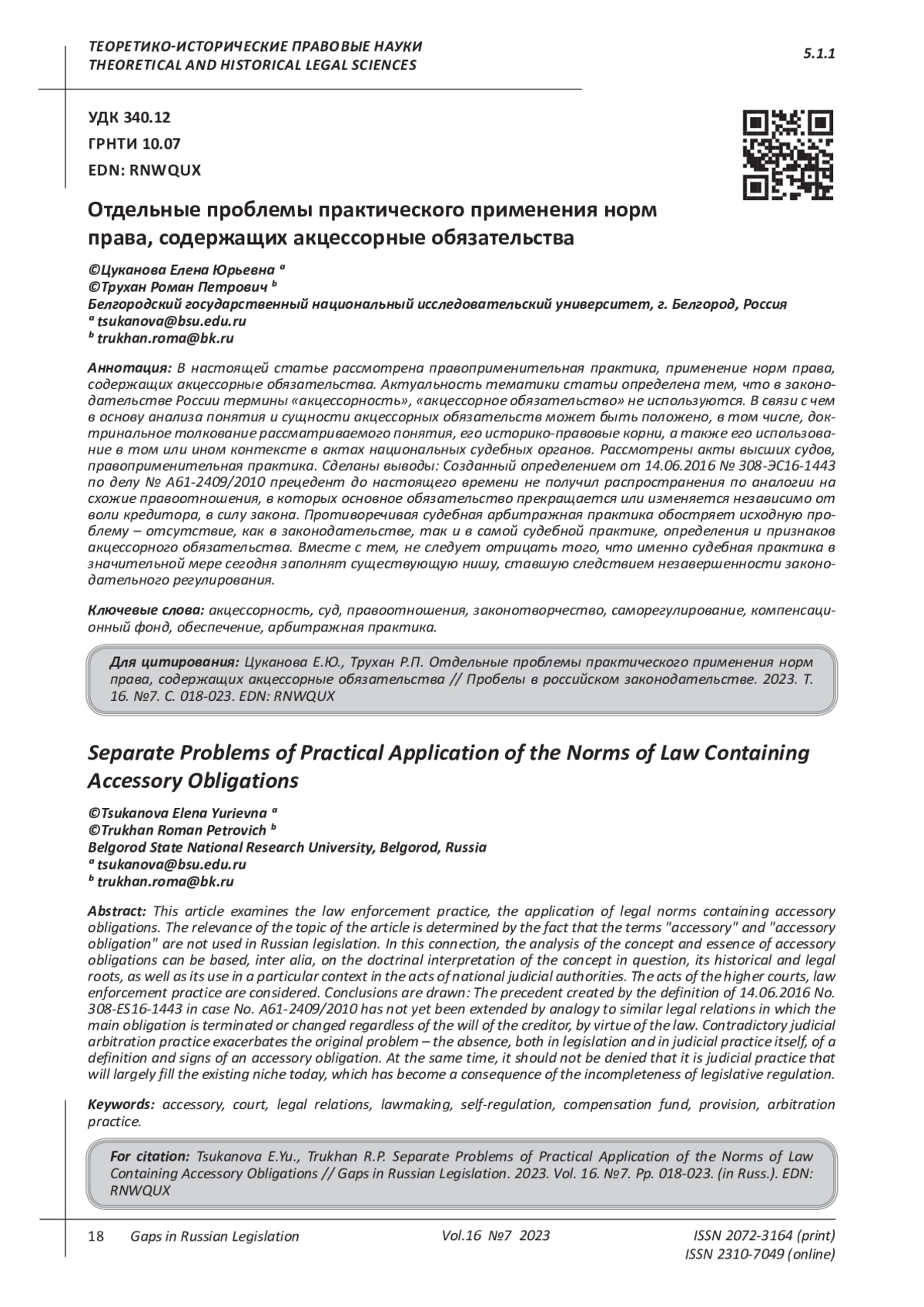 В настоящей статье рассмотрена правоприменительная практика, применение норм права, содержащих акцессорные обязательства. Актуальность тематики статьи определена тем, что в законодательстве России термины «акцессорность», «акцессорное обязательство» не используются. В связи с чем в основу анализа понятия и сущности акцессорных обязательств может быть положено, в том числе, доктринальное толкование рассматриваемого понятия, его историко-правовые корни, а также его использование в том или ином контексте в актах национальных судебных органов. Рассмотрены акты высших судов, правоприменительная практика. Сделаны выводы: Созданный определением от 14.06.2016 № 308-ЭС16-1443 по делу № А61-2409/2010 прецедент до настоящего времени не получил распространения по аналогии на схожие правоотношения, в которых основное обязательство прекращается или изменяется независимо от воли кредитора, в силу закона. Противоречивая судебная арбитражная практика обостряет исходную проблему - отсутствие, как в законодательстве, так и в самой судебной практике, определения и признаков акцессорного обязательства. Вместе с тем, не следует отрицать того, что именно судебная практика в значительной мере сегодня заполнят существующую нишу, ставшую следствием незавершенности законодательного регулирования.