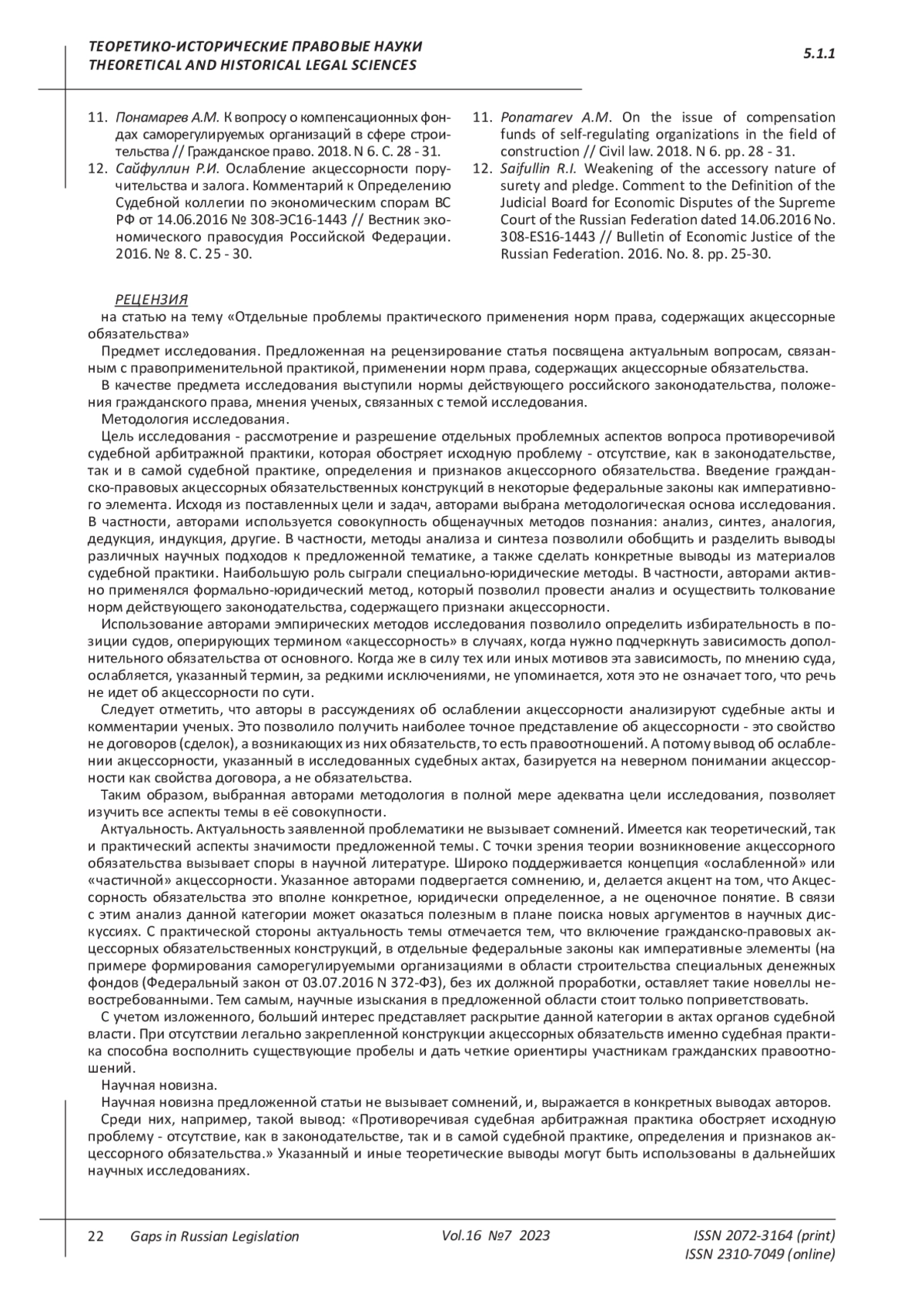 12. Сайфуллин Р.И. Ослабление акцессорности поручительства и залога. Комментарий к Определению Судебной коллегии по экономическим спорам ВС РФ от 14.06.2016 № 308-ЭС16-1443 // Вестник экономического правосудия Российской Федерации. 2016. № 8. С. 25 - 30. EDN: WLNDLJ
