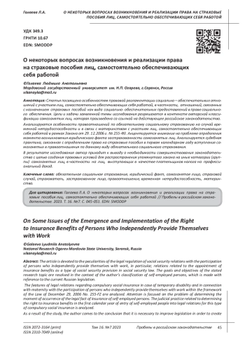Статья посвящена особенностям правовой регламентации социально - обеспечительных отношений с участием лиц, самостоятельно обеспечивающих себя работой, в частности, отношений, связанных с назначением страховых пособий как вида социально- обеспечительных предоставлений в праве социального обеспечения. Цели и задачи заявленной темы исследования разрешаются в контексте авторской классификации самозанятых лиц, которая произведена со ссылкой на действующее российское законодательство. Анализируются особенности правоотношений по обязательному социальному страхованию на случай временной нетрудоспособности и в связи с материнством с участием лиц, самостоятельно обеспечивающих себя работой в рамках Закона от 29. 12.2006 г. № 255-ФЗ. Акцентируется внимание на проблеме определения момента возникновения юридического факта застрахованности самозанятых лиц. Анализируется судебная практика, связанная с определением права на страховые пособия в первом календарном году вступления самозанятых в правоотношения по данному виду обязательного социального страхования. В результате исследования автор приходит к выводу о необходимости совершенствования законодательства с целью создания правовых условий для распространения упомянутого закона на иные категории (группы) самозанятых лиц, в частности на лиц, выступающих в качестве плательщиков налога на профессиональный доход.