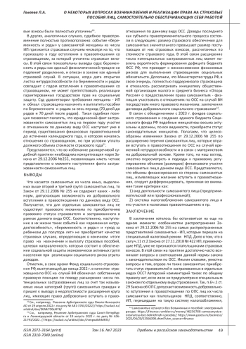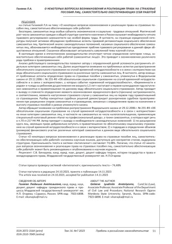 3. Мироненко Е.И. Проблемы правового регулирования социального обеспечения самозанятых // Образование и право.2022. №11. С.54-57. EDN: YKZSZI
