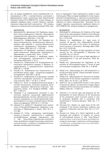 10. Чернова П.А., Шобей Л.Г. Правовой статус самозанятых в Российской Федерации: проблемы и перспективы // Образование и право. 2022. № 4. С. 177-180. EDN: PTCINO