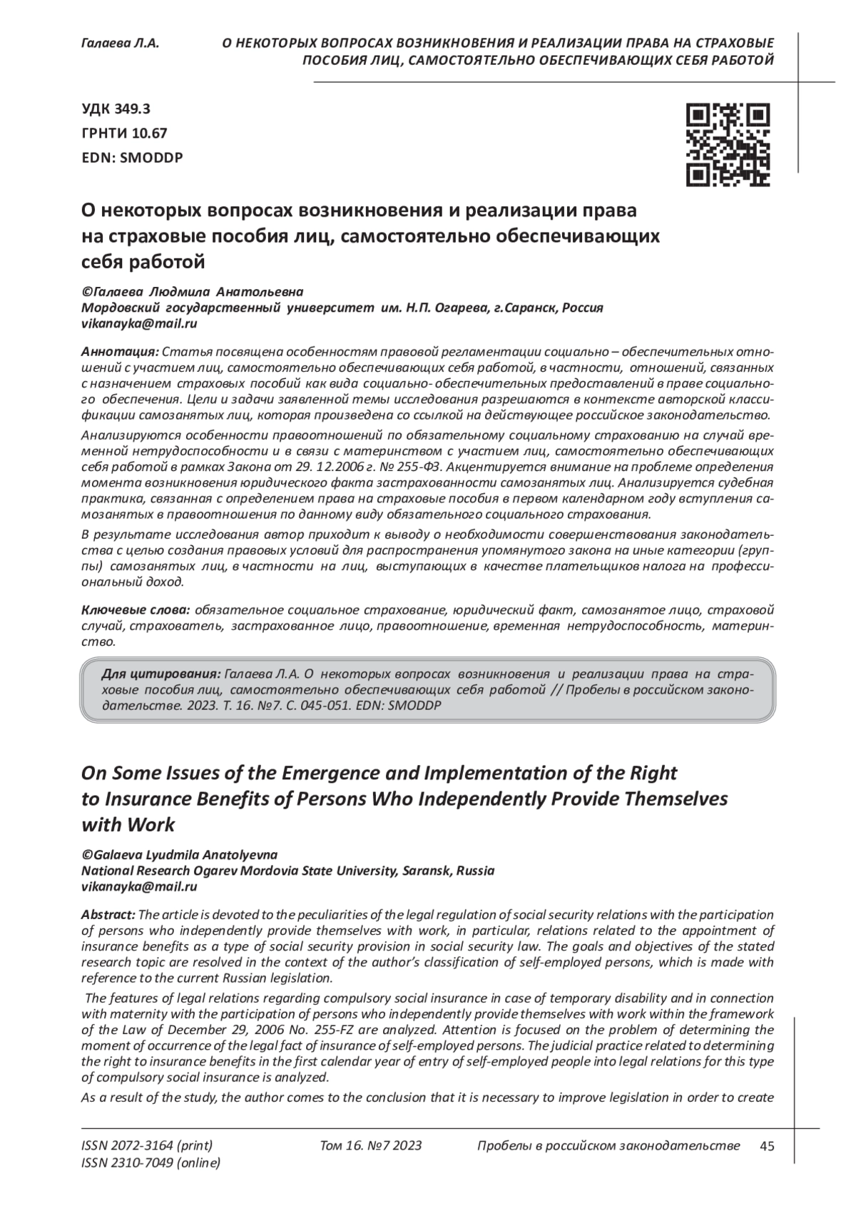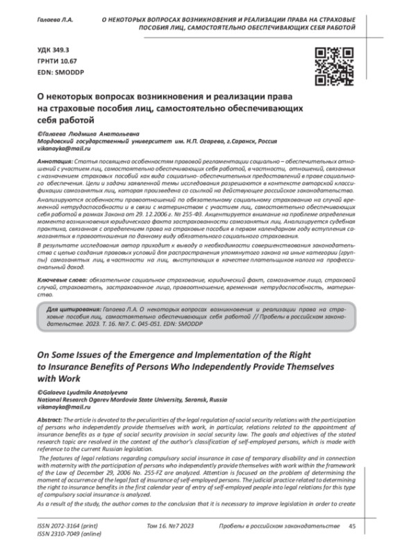 Galaeva L.A., Sayfetdinova A.F. Legal issues of inclusion of persons who independently provide themselves with work in the system of compulsory social insurance // Economics. Sociology. Right. 2020. No. 1 (17). P.120-128.