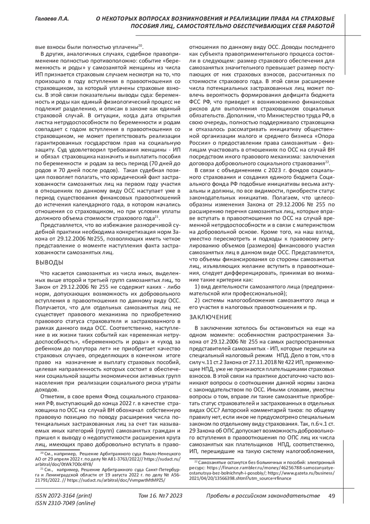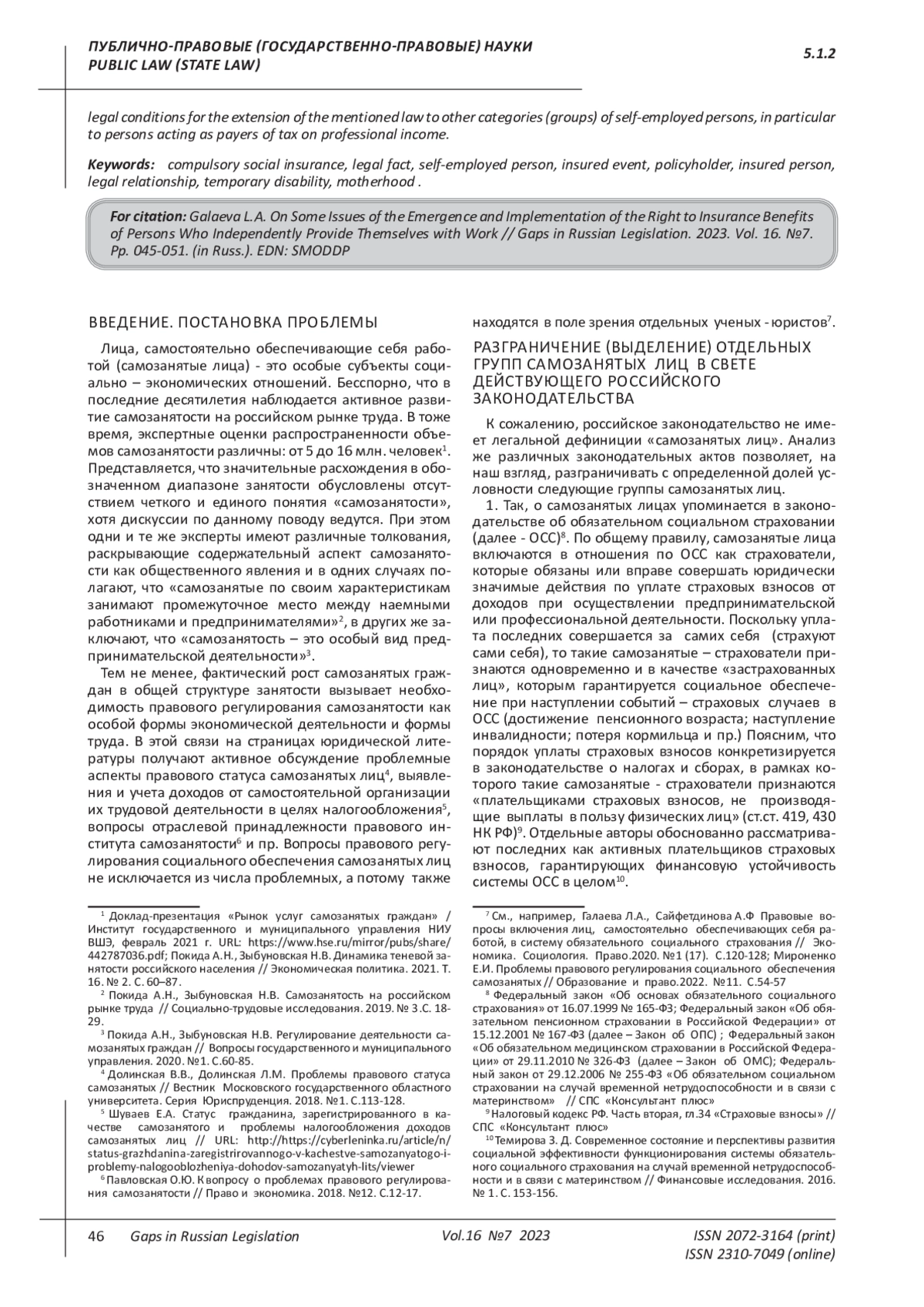 2. Галаева Л.А., Сайфетдинова А.Ф Правовые вопросы включения лиц, самостоятельно обеспечивающих себя работой, в систему обязательного социального страхования // Экономика. Социология. Право. 2020. №1 (17). С.120-128. EDN: SDXOUC