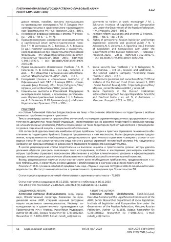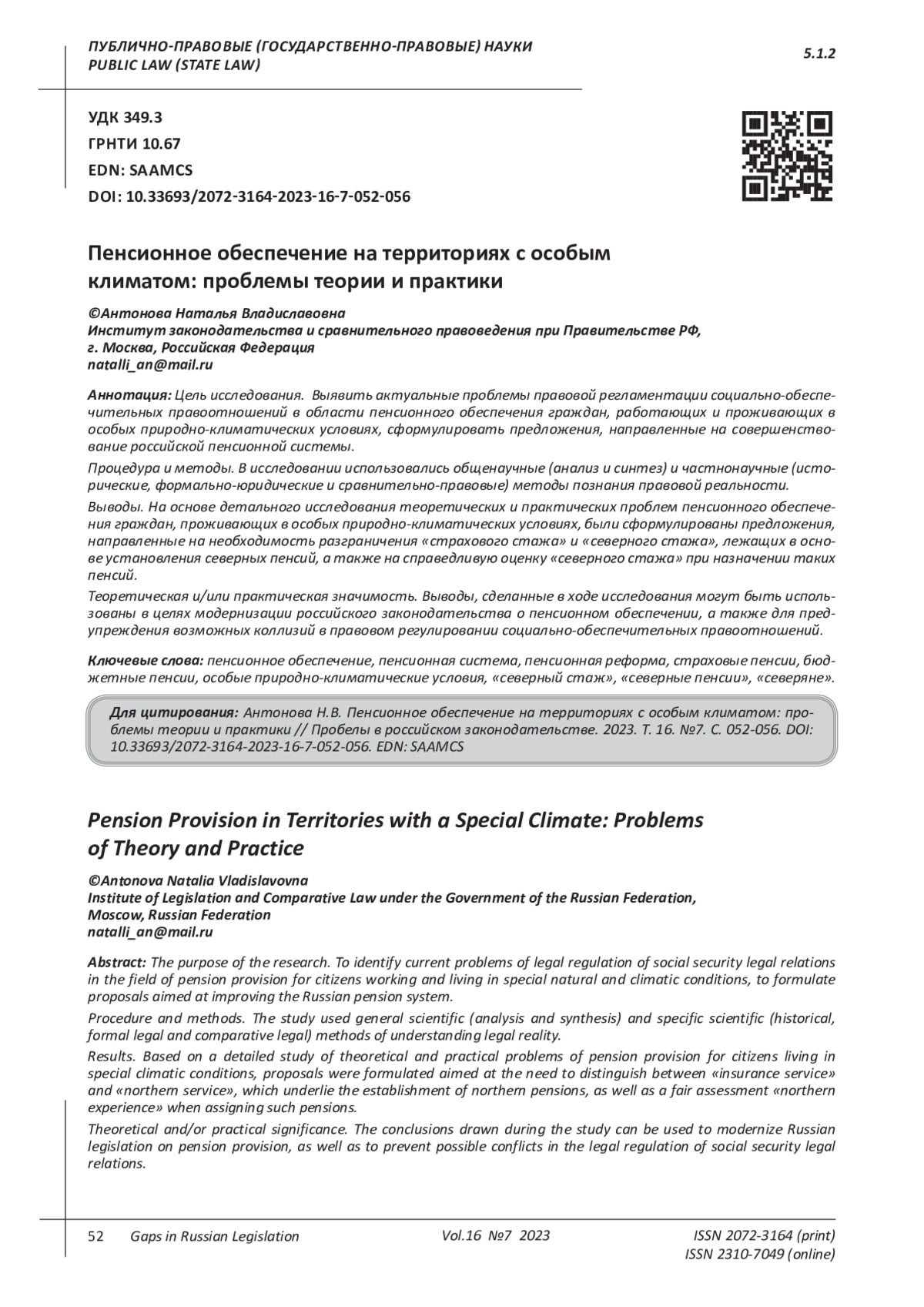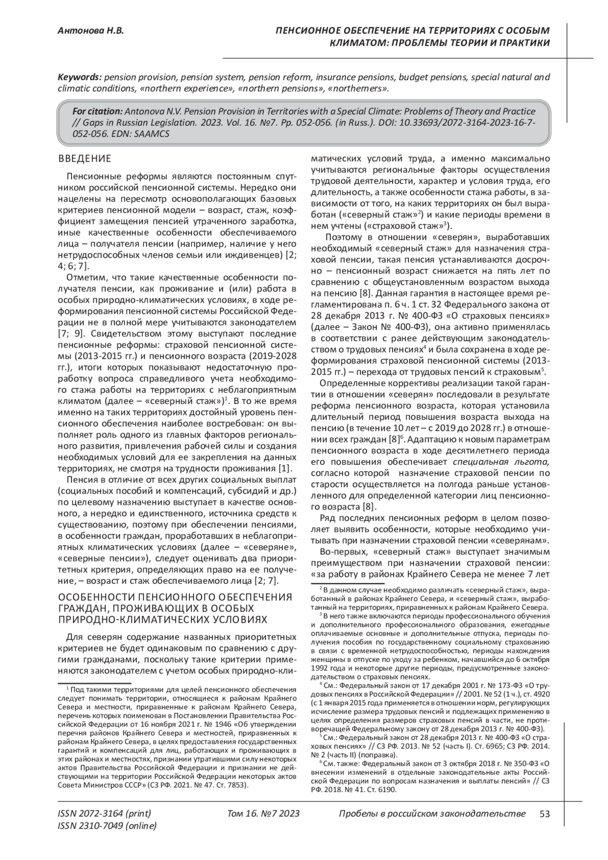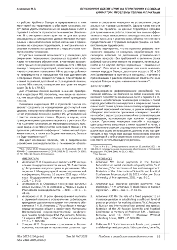 АНТОНОВА Н. В. ПЕНСИОННОЕ ОБЕСПЕЧЕНИЕ НА ТЕРРИТОРИЯХ С ОСОБЫМ КЛИМАТОМ: ПРОБЛЕМЫ ТЕОРИИ И ПРАКТИКИ // ПРОБЕЛЫ В РОССИЙСКОМ ЗАКОНОДАТЕЛЬСТВЕ. 2023. Т. 16 № 7 (42 СТ.)