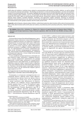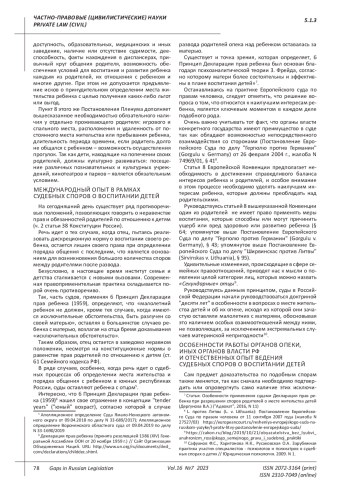 Dergunova V.A. Features of the use by courts of the Declaration of the Rights of the Child when resolving disputes between parents about the place of residence of children / V.A. Dergunova // Lawyer. - 2016. - No. 11. - P. 50-54.