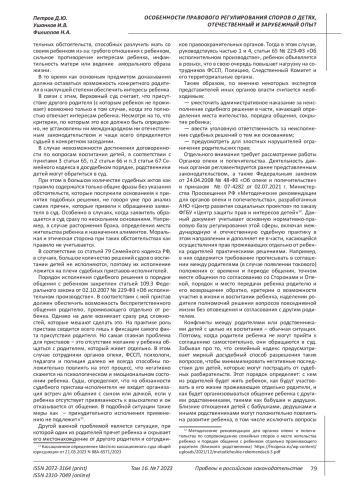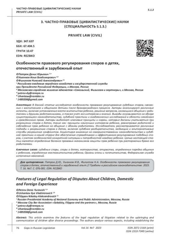 В данной статье исследуются особенности правового регулирования судебных споров, связанных с воспитанием и общением детьми после бракоразводного процесса. Авторы анализируют различные аспекты, включая установление места жительства ребенка, решение вопросов, касающихся общения с родителями и другими родственниками, а также учет его интересов и мнения. Выводы основываются на обзоре существующего законодательства, судебной практики и академических исследований в области семейного и гражданского права. Авторы выделяют ключевые принципы и нормы, которые должны учитываться при разрешении споров о детях, такие как: принципы наилучших интересов ребенка, равноправие родителей и соблюдение прав ребенка на общение с обоими родителями. Исследователи рассматриваются различные подходы к разрешению споров о детях, включая судебное разбирательство, медиацию и альтернативные способы разрешения конфликтов. Акцентируя внимание на совершенствовании законодательства и судебной практики в нашей стране для обеспечения справедливого и эффективного регулирования подобных споров, с учетом особенностей конкретной ситуации и потребностей каждого ребенка. Целью настоящей статьи является определение баланса правовых механизмов защиты прав ребенка при расторжении брака его родителями.