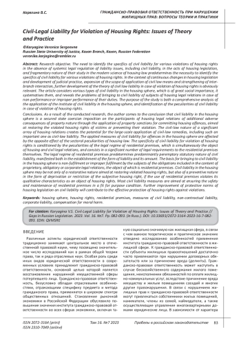 Цель исследования. Отсутствие системного правового регулирования вопросов ответственности, в том числе гражданско-правовой, в актах жилищного законодательства, фрагментарный характер их исследования в современной науке жилищного права предопределяют необходимость выявления специфики гражданско-правовой ответственности при различных нарушениях жилищных прав. В условиях непрерывного изменения жилищного законодательства и развития судебной практики, расширения сферы применения гражданско-правовых средств и усиления межотраслевого взаимодействия, несомненно актуальной видится дальнейшая разработка теории гражданско-правовой ответственности при нарушении жилищных прав. В статье рассматриваются различные виды гражданско-правовой ответственности в жилищной сфере, имеющей большое социальное значение, проводится их систематизация, выявляются проблемы привлечения к гражданско-правовой ответственности субъектов жилищных правоотношений в случае неисполнения либо ненадлежащего исполнения ими своих обязанностей. Целью исследования является комплексный анализ применения института гражданско-правовой ответственности в жилищной сфере, выявление особенностей гражданско-правовой ответственности при нарушении жилищных прав. Выводы. В результате проведенного исследования автор приходит к выводу, что гражданско-правовая ответственность в жилищной сфере - это обеспеченное государственным принуждением возложение на участников жилищных правоотношений дополнительных неблагоприятных последствий имущественного характера посредством применения имущественных санкций за совершение ими жилищных правонарушений, направленных на восстановление нарушенных жилищных прав потерпевших или предупреждение их нарушения. Гражданско-правовая природа значительного массива жилищных отношений создает потенциальную возможность масштабного применения гражданско-правовых средств, в том числе такого важнейшего как гражданско-правовая ответственность. Применяемые меры гражданско-правовой ответственности за правонарушения в жилищной сфере испытывают обратное воздействие со стороны отраслевых особенностей жилищного права. Специфика гражданско-правовой ответственности при нарушении жилищных прав обусловлена особенностями правового режима жилого помещения, выступающего одновременно объектом жилищных и гражданских правоотношений, и заключающихся в значительном количестве законодательных требований к самим жилым помещениям. Правовой режим жилого помещения предопределяет преимущественно императивно установленный законом характер гражданско-правовой ответственности, проявляющийся как в установлении формы ответственности, так и ее размера. Основанием для привлечения к гражданско-правовой ответственности в жилищной сфере является неисполнение или ненадлежащее исполнение субъектами обязанностей, входящих в содержание вещных, обязательственных или корпоративных правоотношений, объектом которых выступает жилое помещение. Гражданско-правовая ответственность в жилищной сфере может носить не только восстановительный характер, направленный на восстановление нарушенных жилищных прав, но и пресекательный характер в виде лишения или ограничения субъективного жилищного права, если при использовании жило