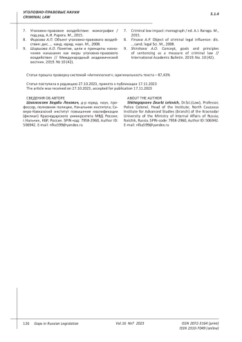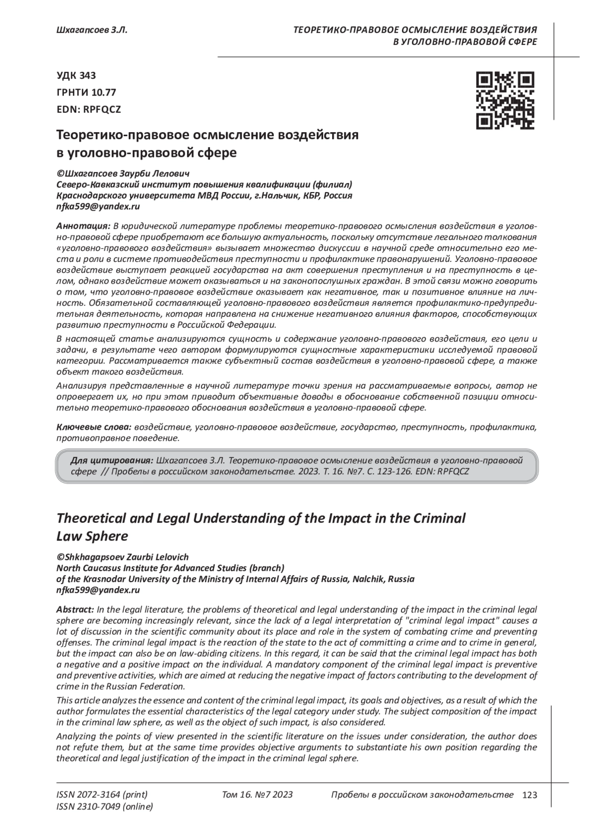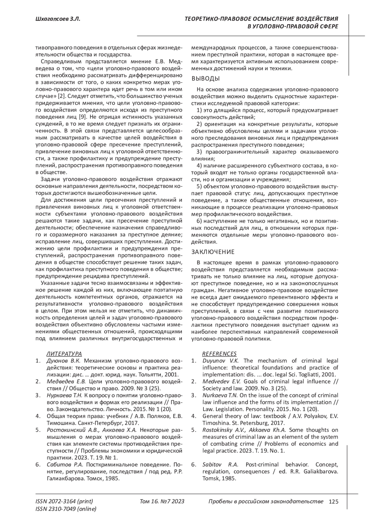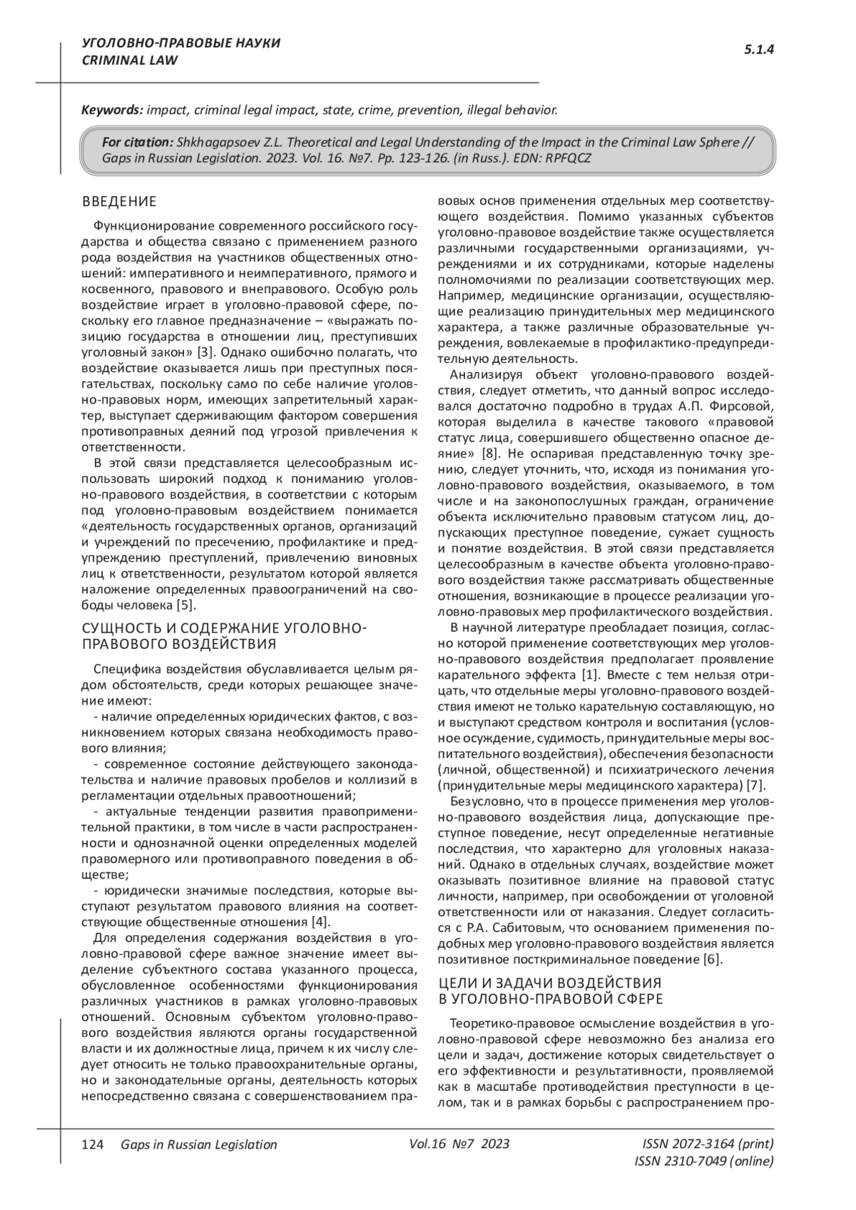 ШХАГАПСОЕВ З. Л. ТЕОРЕТИКО-ПРАВОВОЕ ОСМЫСЛЕНИЕ ВОЗДЕЙСТВИЯ В УГОЛОВНО-ПРАВОВОЙ СФЕРЕ // ПРОБЕЛЫ В РОССИЙСКОМ ЗАКОНОДАТЕЛЬСТВЕ. 2023. Т. 16 № 7 (42 СТ.)