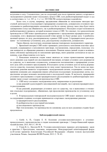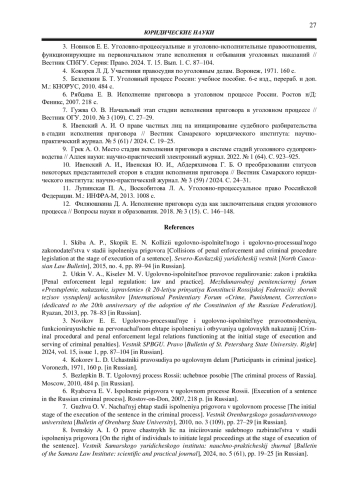 1. Скиба А. П., Скорик Е. Н. Коллизии уголовно-исполнительного и уголовно-процессуального законодательства в стадии исполнения приговора // Северо-Кавказский юридический вестник. 2015. № 4. С. 89-94. EDN: VDOZPV