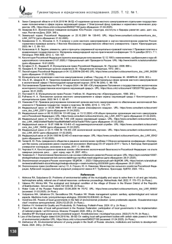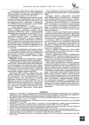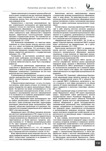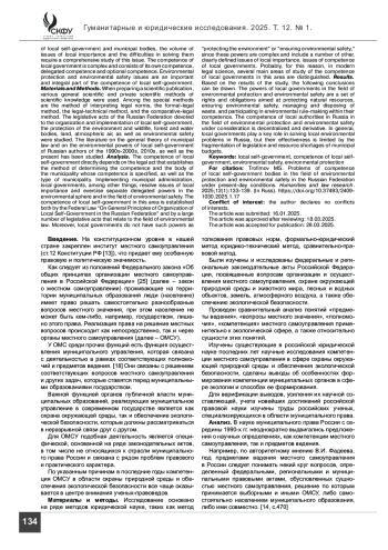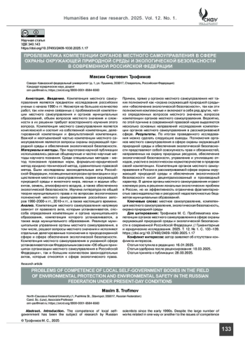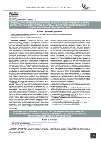 ТРОФИМОВ М. С. ПРОБЛЕМАТИКА КОМПЕТЕНЦИИ ОРГАНОВ МЕСТНОГО САМОУПРАВЛЕНИЯ В СФЕРЕ ОХРАНЫ ОКРУЖАЮЩЕЙ ПРИРОДНОЙ СРЕДЫ И ЭКОЛОГИЧЕСКОЙ БЕЗОПАСНОСТИ В СОВРЕМЕННОЙ РОССИЙСКОЙ ФЕДЕРАЦИИ // ГУМАНИТАРНЫЕ И ЮРИДИЧЕСКИЕ ИССЛЕДОВАНИЯ. 2025. ТОМ 12, № 1