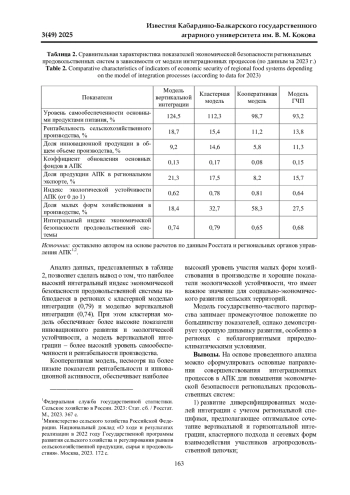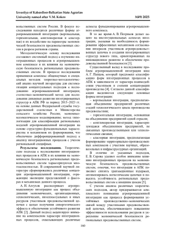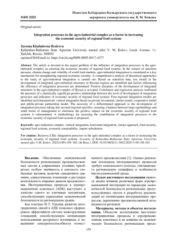 Статья посвящена актуальной проблеме влияния интеграционных процессов в агропромышленном комплексе на экономическую безопасность региональных продовольственных систем. В условиях санкционного давления, климатических изменений и волатильности мировых рынков продовольствия агропромышленная интеграция рассматривается как ключевой механизм укрепления региональной экономической безопасности. Проведен комплексный анализ теоретических подходов к исследованию агропромышленной интеграции. На основе статистических данных выявлены ключевые тенденции развития интегрированных агропромышленных структур в российских регионах и определены факторы, влияющие на эффективность интеграционных процессов. Выявлена положительная динамика развития интегрированных структур в АПК России. Корреляционно-регрессионный анализ подтвердил наличие статистически значимой положительной связи между уровнем развития интеграционных процессов и показателями экономической безопасности региональных продовольственных систем. Выделены и охарактеризованы четыре региональные модели интеграции: вертикальная интеграция на основе частных инвестиций, кластерная модель, кооперативная модель и модель государственно-частного партнерства. Обоснована необходимость дифференцированного подхода к развитию интеграционных процессов с учетом региональной специфики, обеспечивающего баланс между крупными агрохолдингами и малыми формами хозяйствования для максимизации положительного влияния на экономическую безопасность региональных продовольственных систем. Предложена методика оценки вклада интеграционных процессов в экономическую безопасность региональных продовольственных систем.