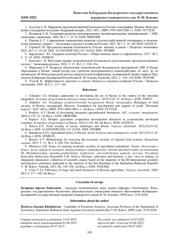 8. Мирзоева А. Р. Вопросы обеспечения экономической безопасности предприятий АПК // Наука, образование и бизнес: новый взгляд или стратегия интеграционного взаимодействия: сб. науч. тр. по материалам III Международной научно-практической конференции, посвященной памяти первого Президента Кабардино-Балкарской Республики В. М. Кокова. Нальчик, 2023. С. 150-156. EDN: TOJUMI
