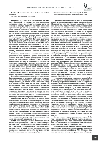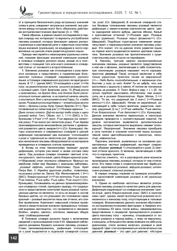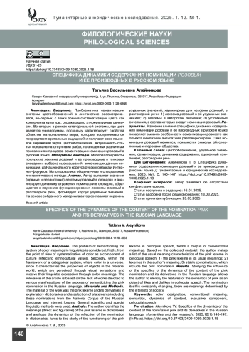 АЛЕЙНИКОВА Т. В. СПЕЦИФИКА ДИНАМИКИ СОДЕРЖАНИЯ НОМИНАЦИИ РОЗОВЫЙ И ЕЕ ПРОИЗВОДНЫХ В РУССКОМ ЯЗЫКЕ // ГУМАНИТАРНЫЕ И ЮРИДИЧЕСКИЕ ИССЛЕДОВАНИЯ. 2025. ТОМ 12, № 1
