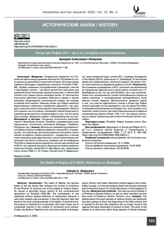 Введение. Генеральное сражение 4-й Сирийской войны между армиями Антиоха III и Птолемея IV стало одним из крупнейших в античной истории. Его ход в целом известен благодаря подробному описанию Полибия (V.82– 86). Особое внимание исследователей привлекает участие в нём боевых слонов – оно было достаточно массовым для сражений эпохи эллинизма, весьма успешным, и именно бой слонов стал самым ярким эпизодом битвы. В тактическом отношении действия слоновых корпусов в связке с иными войсками представляют несомненный интерес как пример combined arms warfare. Наконец, битва при Рафии является единственным известным сражением древности, где друг другу противостояли слоны разного происхождения. Именно этот момент, как ни странно, привлекает учёных более всего; оживлённая дискуссия в историографии о том, что это могли быть за виды, зародилась давно и продолжается до сих пор.
