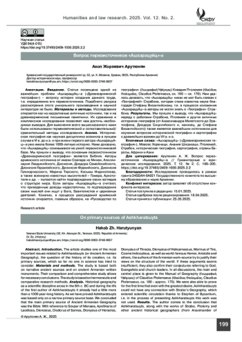 Введение. Статья посвящена одной из важнейших проблем «Ашхарацуйц»-а («Древнеармянской географии») – вопросу истории создания данного труда, т. е. определению его первоисточников. Подобного ракурса рассмотрения этого уникального произведения в научной литературе не было.