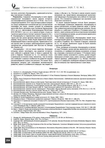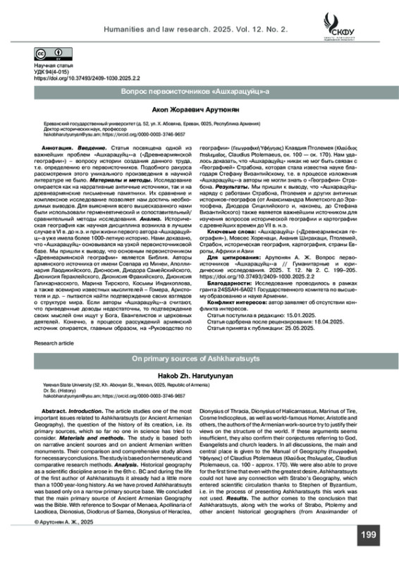 Результаты. Мы пришли к выводу, что «Ашхарацуйц» наряду с работами Страбона, Птолемея и других античных историков-географов (от Анаксимандра Милетского до Эратосфена, Диодора Сицилийского и, наконец, до Стефана Византийского) также является важнейшим источником для изучения вопросов исторической географии и картографии с древнейших времен до VII в. н. э.