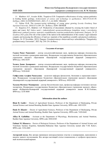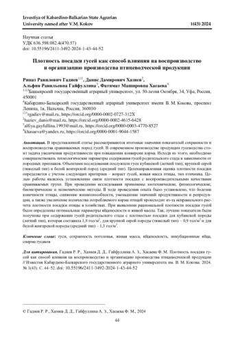 13. Копылова С. В., Хабиров А. Ф. Продуктивность потомков, полученных при скрещивании линдовской породы гусей и wanxi // Роль Лидера нации в индустриализации агропромышленного комплекса страны и повышении эффективности землепользования: материалы республиканской научно-практической конференции, Дангара, 24-25 ноября 2023 года. Дангара: Государственное образовательное учреждение “Дангаринский государственный Университет”, 2023. С. 230-234. EDN: SLXRDW