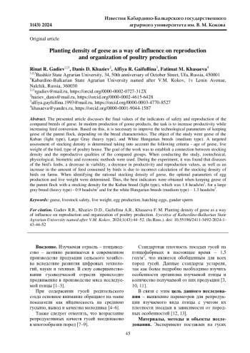 В представленной статье рассматриваются итоговые значения показателей сохранности и воспроизводства сравниваемых пород гусей. В современном производстве продукции гусеводства стоит задача увеличения продуктивности при повышении конверсии корма. Исходя из этого, необходимо совершенствовать технологические параметры содержания гусей родительского стада в зависимости от породных признаков. Объектами исследования послужили гуси кубанской (легкий тип), крупной серой (тяжелый тип) и белой венгерской пород (средний тип). Целенаправленная оценка плотности посадки определяется с учетом следующих критериев - возраст гусей, живая масса птицы, тип птичника. Целью работы являлось установление связи плотности посадки с воспроизводительными качествами сравниваемых групп. При проведении исследования применены зоотехнические, физиологические, биометрические и экономические методы. В ходе проведения опыта было установлено, что болезни конечности птицы, снижение жизнеспособности, уменьшение значений продуктивности и репродукции, а также увеличение количества потребляемого корма птицей происходит из-за неправильного расчета плотности посадки птицы в хозяйствах. При выявлении рациональной плотности посадки гусей были определены оптимальные параметры яйценоскости и живой массы. Так, лучшие показатели были получены при содержании гусей родительского стада с плотностью посадки для кубанской породы (легкий тип), которая составила 1,8 гол/м2, для крупной серой породы (тяжелый тип) - 0,9 гол/м2 и для белой венгерской породы (средний тип) - 1,3 гол/м2.