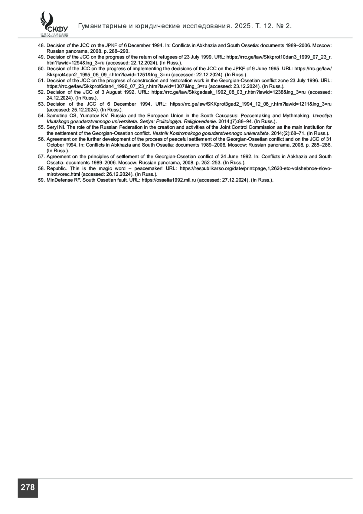 43. Решение СКК о деятельности ССПМ в зоне грузино-осетинского конфликта от 13 февраля 1997 г. URL: https://rrc.ge/law/Skkprot7dan1_1997_02_13_r.htm?lawid=1262&lng_3=ru (дата обращения: 19.12.2024).