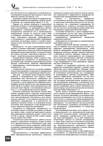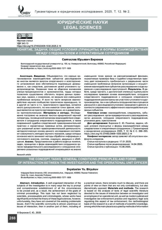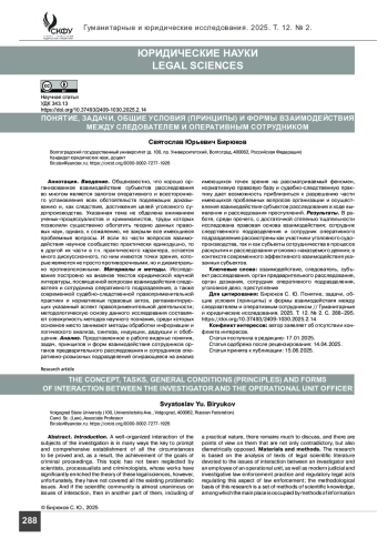 Материалы и методы. Исследование построено на анализе текстов юридической научной литературы, посвященной вопросам взаимодействия следователя и сотрудника оперативного подразделения, а также современной судебно-следственной правоприменительной практики и нормативных правовых актов, регламентирующих указанный аспект правоприменительной деятельности; методологическую основу данного исследования составляют совокупность методов научного познания, среди которых основное место занимают методы обработки информации и логического анализа, синтеза, индукции, дедукции и обобщения.