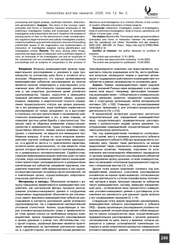 Анализ. Представленное в работе виденье понятия, задач, принципов и форм взаимодействия сотрудников органов предварительного расследования и сотрудников оперативно-розыскных подразделений опирающееся на анализ имеющихся точек зрения на рассматриваемый феномен, нормативную правовую базу и судебно-следственную практику дает возможность приблизиться к разрешению части имеющихся проблемных вопросов организации и осуществления взаимодействия субъектов расследования в ходе выявления и расследования преступлений.