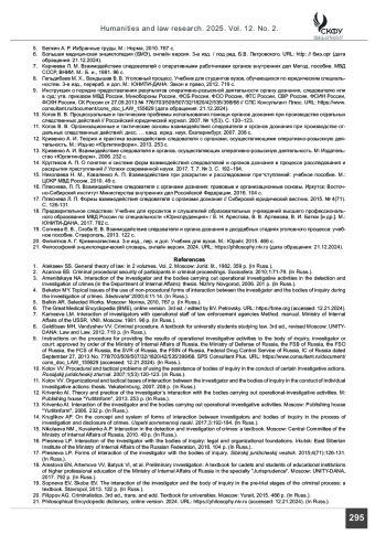 14. Кругликов А. П. О понятии и системе форм взаимодействия следователей и органов дознания в процессе расследования и раскрытия преступлений // Успехи современной науки. 2017. Т. 7. № 3. С. 192-194.