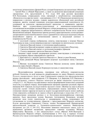 Статья посвящена рассмотрению особенностей иконографической программы росписей, посвященных святому патрону Кронштадтского Морского собора Николая Чудотворцу, исполненных в начале XX века художником Михаилом Васильевым, в контексте национально-романтического направления модерна, связанного с идеологемой «Святой Руси». Включение новых сюжетов о почитаемых иконах Николая Чудотворца на Руси в канонично разработанный иконографический ряд деяний святителя, стилистически изображенных в духе русского былинного сказа, отражало национально-патриотическую направленность храмовой иконографии, связанную с идеей зримого воплощения «Святой Руси» как единственной преемницы истинной христианской веры.