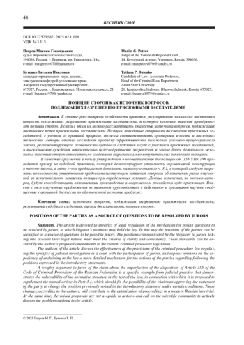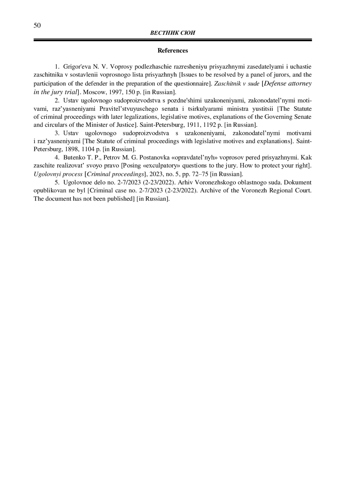 4. Бутенко Т. П., Петров М. Г. Постановка “оправдательных” вопросов перед присяжными. Как защите реализовать свое право // Уголовный процесс. 2023. № 5. С. 72-75. EDN: XZUESU