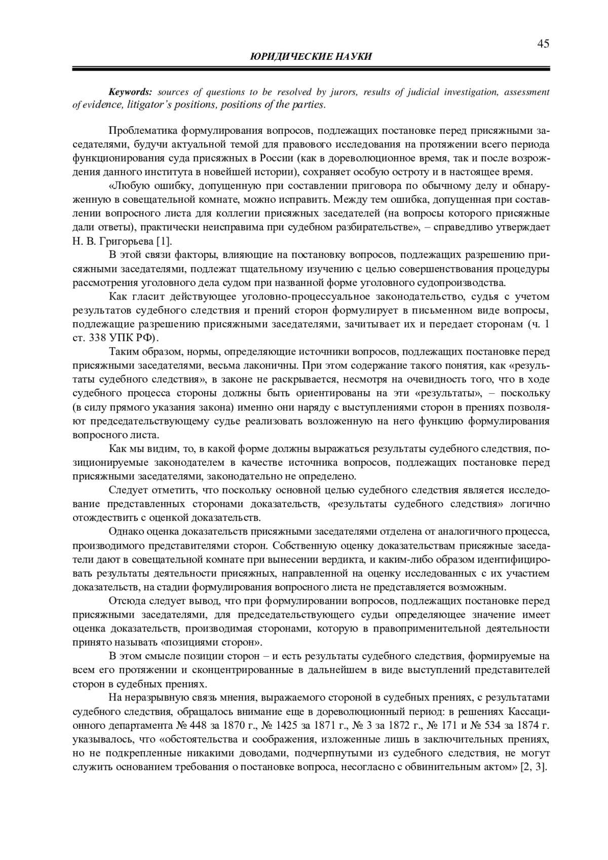 1. Григорьева Н. В. Вопросы, подлежащие разрешению коллегией присяжных заседателей, и участие защитника в составлении вопросного листа // Защитник в суде присяжных. М., 1997. 150 c.