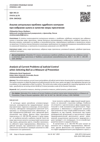 Livshits Yu., Zuev S. Bail as a preventive measure. // Legality. 2003. No. 5. P. 11-13. EDN: YSGYIJ