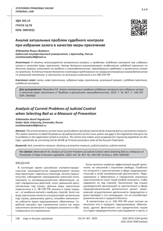 В статье анализируются актуальные вопросы и проблемы судебного контроля при избрании залога в качестве меры пресечения. Автор детально рассматривает особенности судебной практики по данному вопросу, указывает на пробелы в законодательстве, порождающие проблемы в применении залога на практике. В статье также делаются некоторые предложения по совершенствованию законодательства по указанной тематике, в частности по внесению изменений в ст.106 УПК РФ