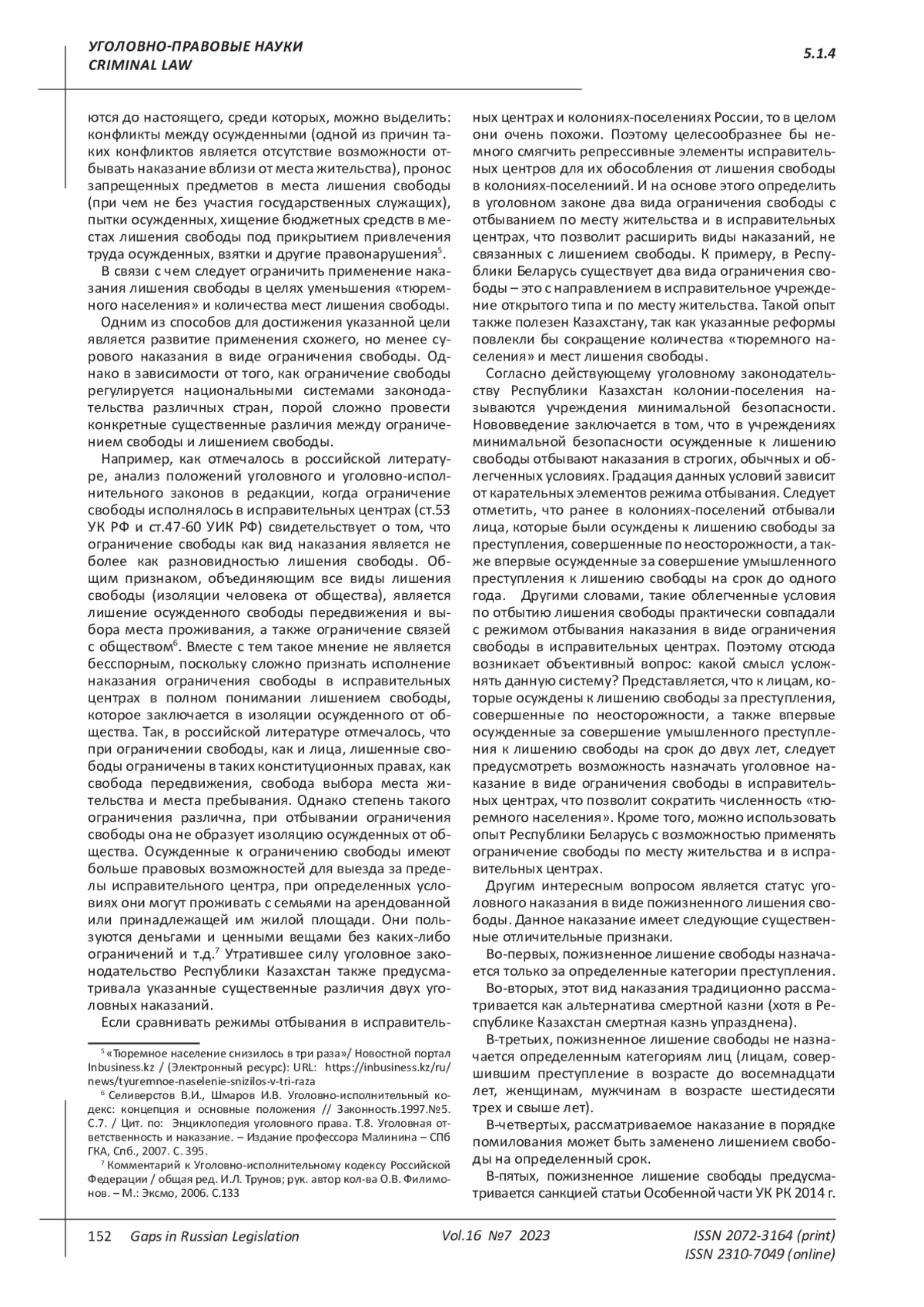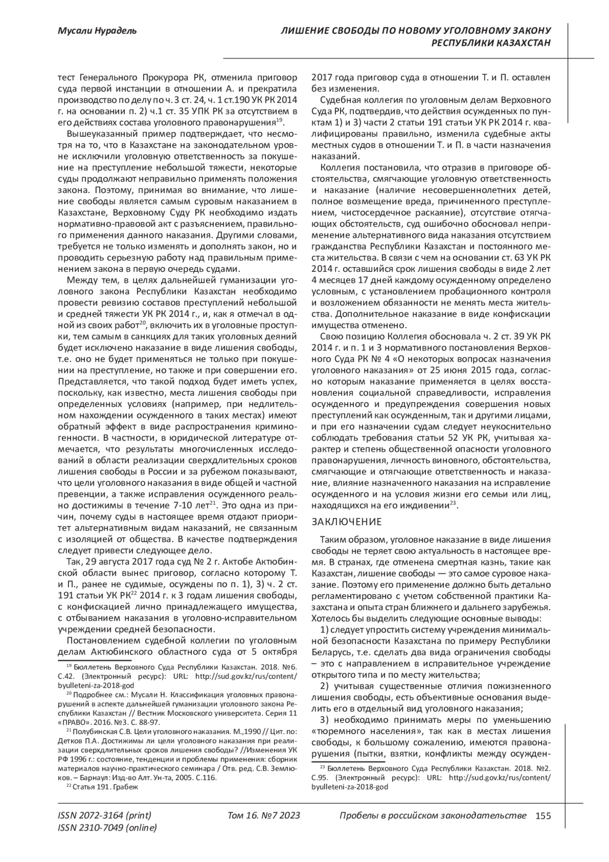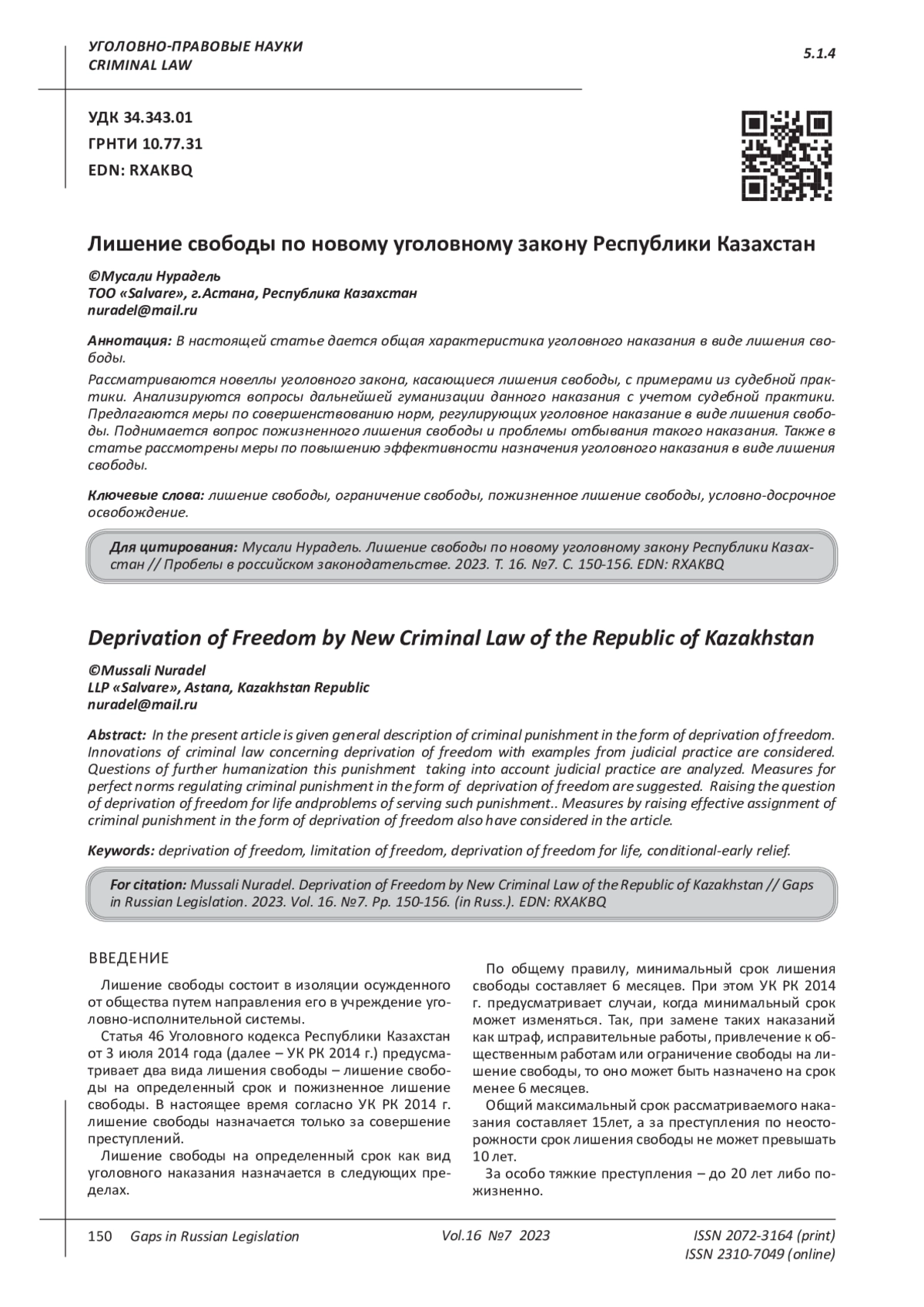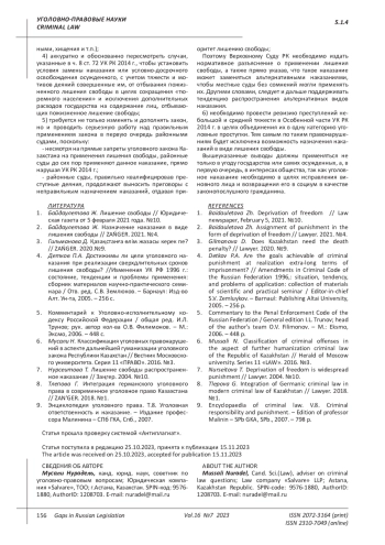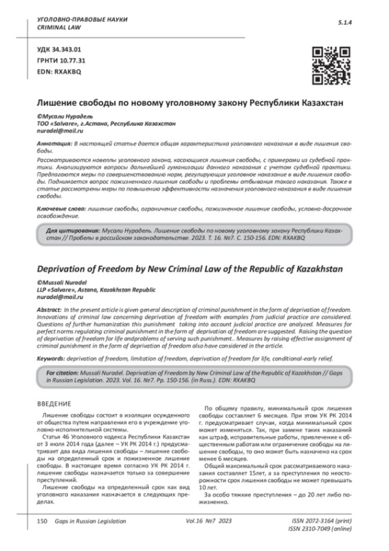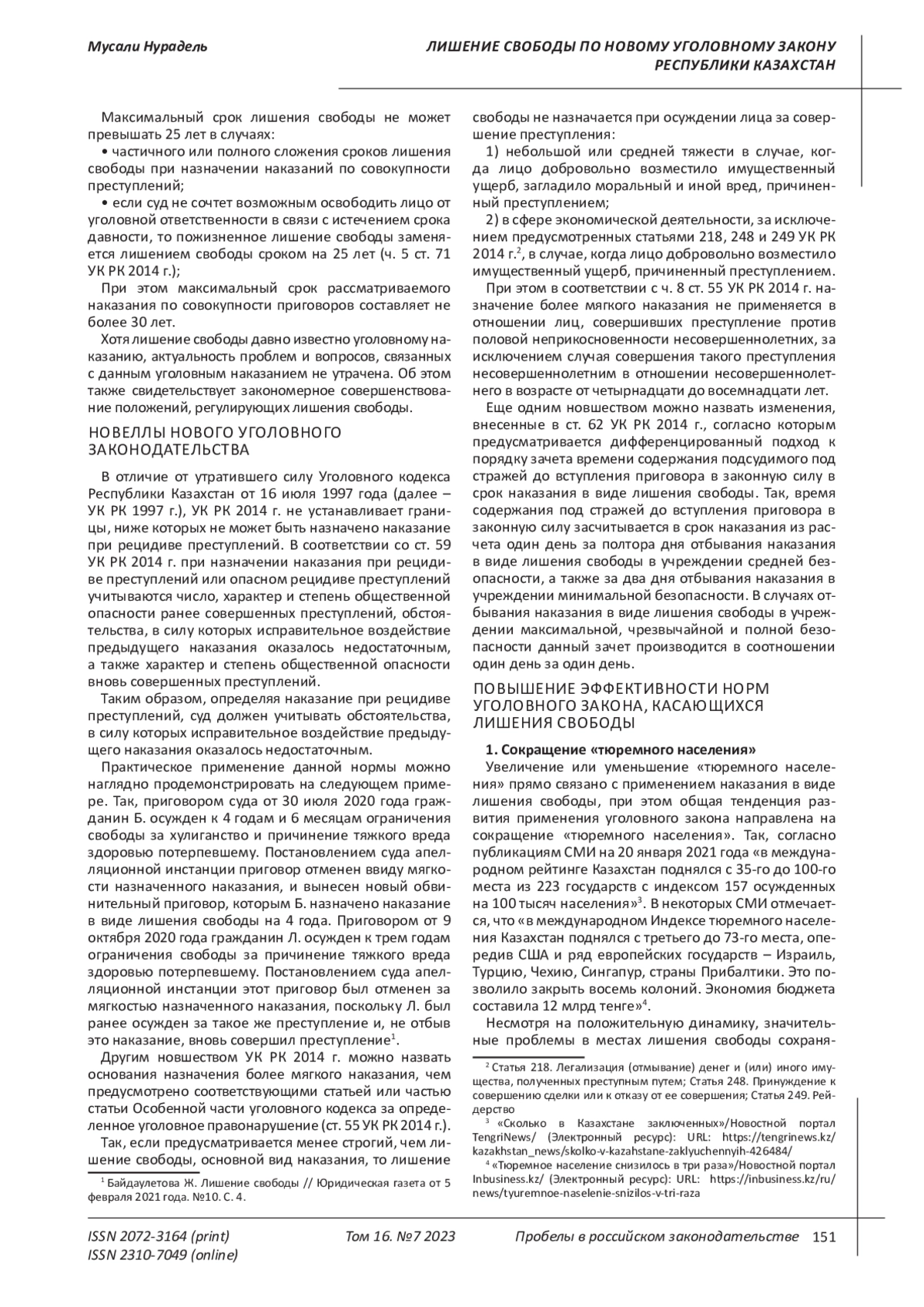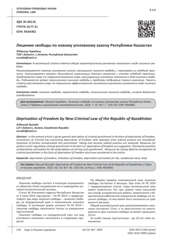 МУСАЛИ Н. ЛИШЕНИЕ СВОБОДЫ ПО НОВОМУ УГОЛОВНОМУ ЗАКОНУ РЕСПУБЛИКИ КАЗАХСТАН // ПРОБЕЛЫ В РОССИЙСКОМ ЗАКОНОДАТЕЛЬСТВЕ. 2023. Т. 16 № 7 (42 СТ.)