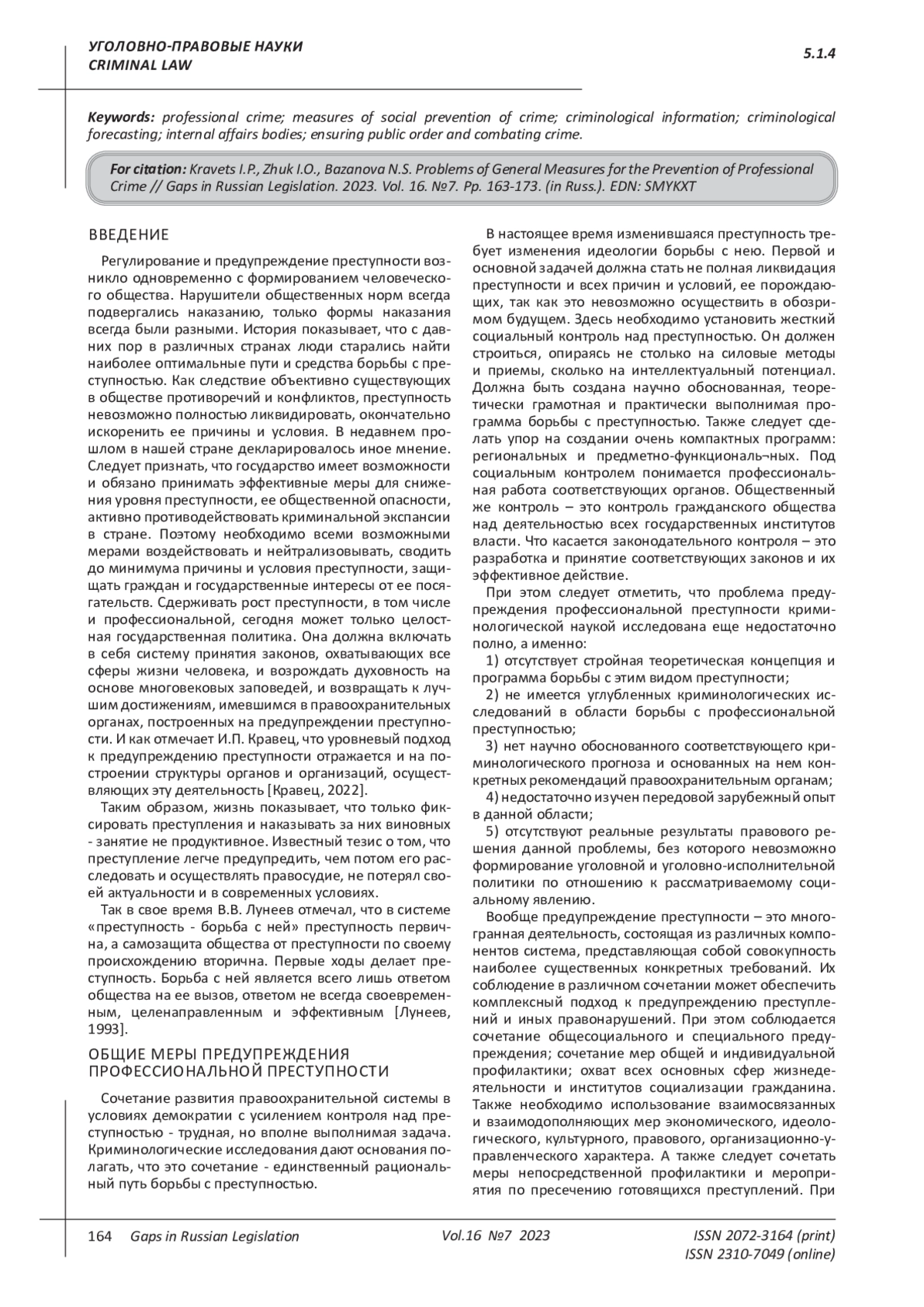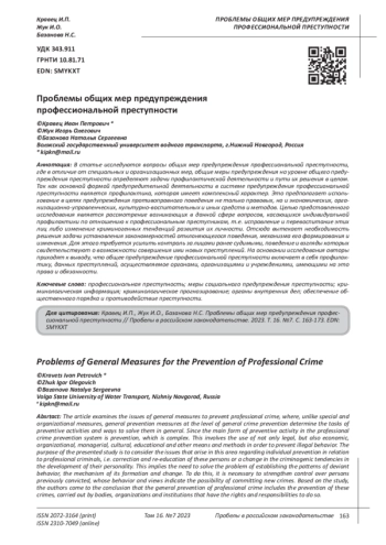 Kravets, I.P., (2022), Problems of special measures to prevent professional criminality. Gaps in Russian legislation. 2022. Vol.15. №2. P. 134-143. EDN: PZUKUF