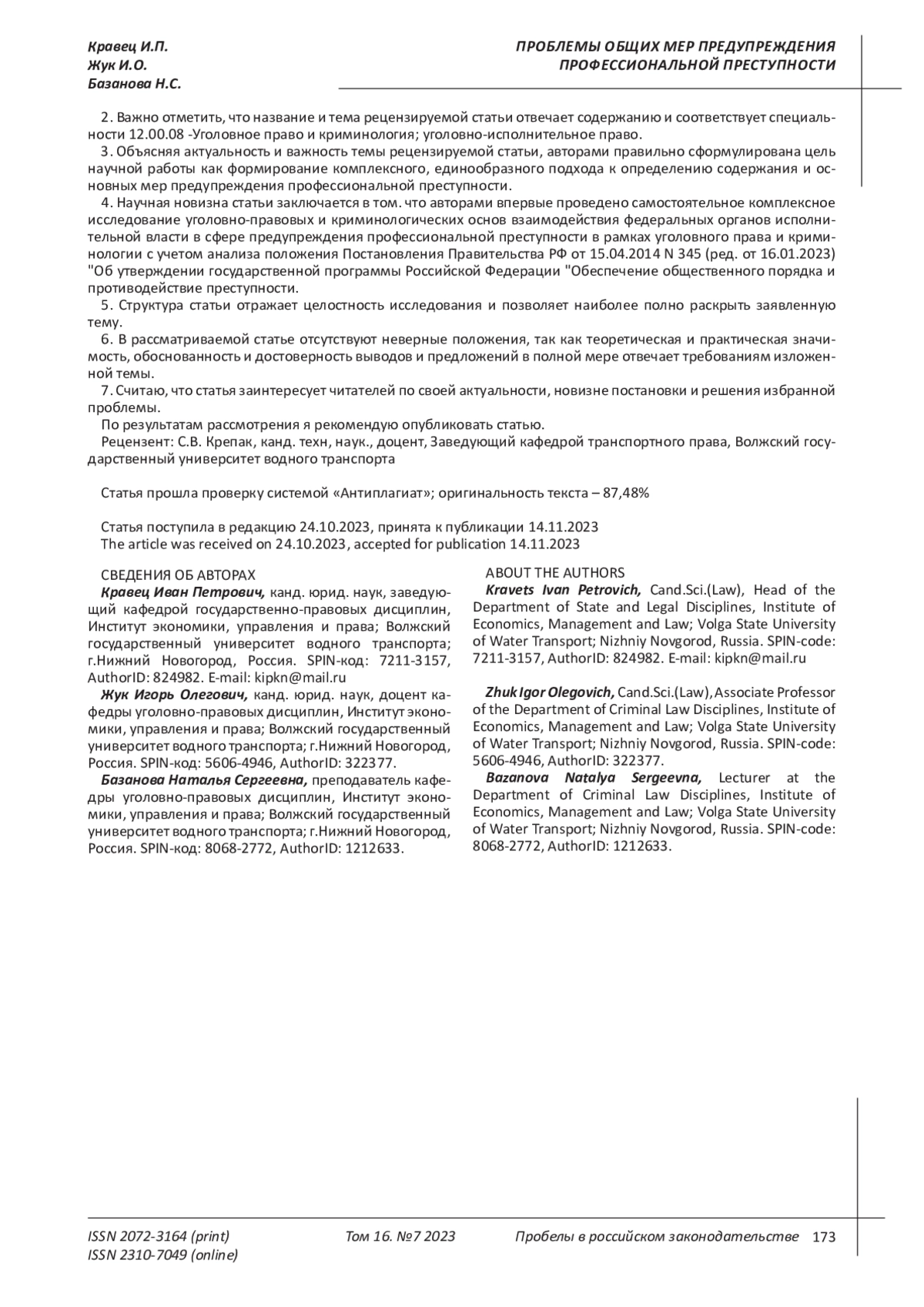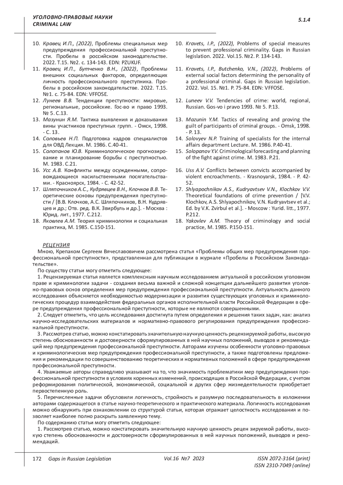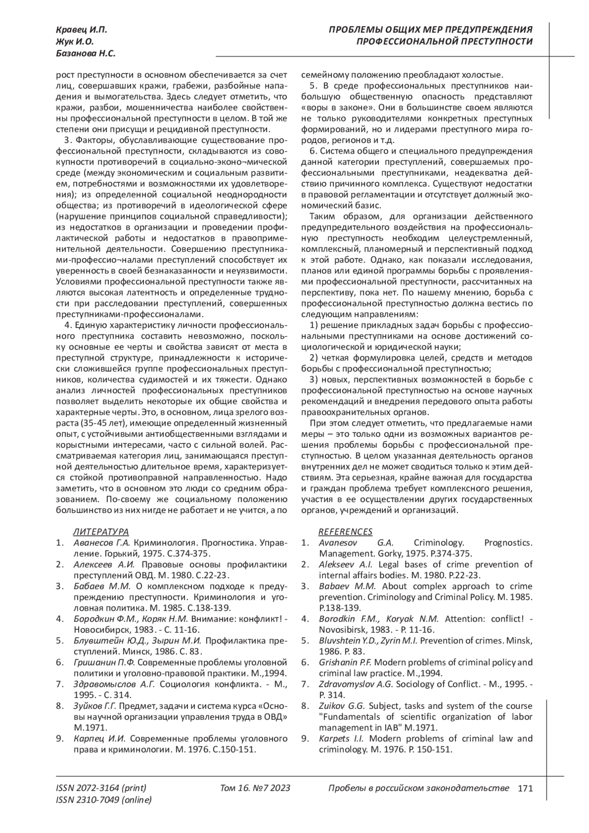 10. 	Кравец И.П., (2022), Проблемы специальных мер предупреждения профессиональной преступности. Пробелы в российском законодательстве. 2022. Т.15. №2. с. 134-143. EDN: PZUKUF
