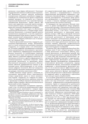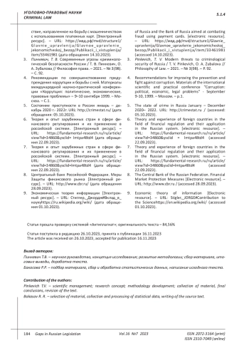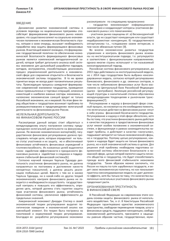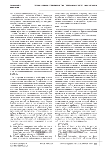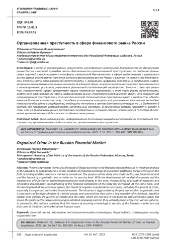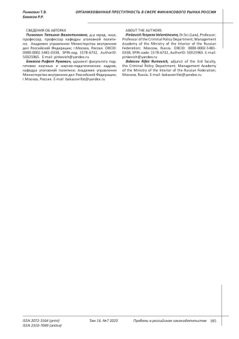 ПИНКЕВИЧ Т. В., БАКАСОВ Р. Р. ОРГАНИЗОВАННАЯ ПРЕСТУПНОСТЬ В СФЕРЕ ФИНАНСОВОГО РЫНКА РОССИИ // ПРОБЕЛЫ В РОССИЙСКОМ ЗАКОНОДАТЕЛЬСТВЕ. 2023. Т. 16 № 7 (42 СТ.)