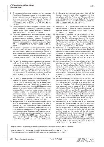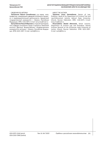 Khusnutdinov, R. M. On the issue of the expiration of the arrest period imposed on securities and other property / R. M. Khusnutdinov // Current problems in the development of Russian legislation and the practice of its application: Collection of scientific articles based on the results of the All-Russian Scientific and Practical Conference with international participation, Izhevsk, November 15-16, 2022. - Izhevsk: Izhevsk Institute (branch) of the Federal State Budgetary Educational Institution of Higher Education “VSUYU (RPA of the Ministry of Justice of Russia)”, 2022. - P. 1422-1428. EDN: SJULFT