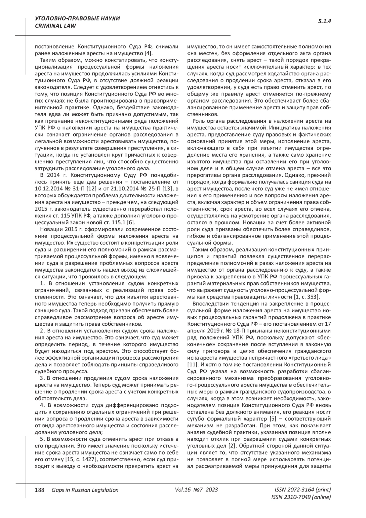 Цель исследования. Целью исследования выступает изучение процесса конституционализации и его влияния на процессуальную форму наложения ареста на имущество в уголовном судопроизводстве. Предметом исследования является развитие данной процессуальной формы на протяжении более 21 года, начиная с принятия УПК РФ (2001 г.). Авторы статьи обращают внимание на изменения законодательства, связанные с развитием процессуальной формы наложения ареста на имущество, а также на его связь с конституционными принципами. Исследование показывает, что конституционализация играет важную роль в развитии процессуальной формы наложения ареста на имущество. Она способствует установлению правового порядка, ограничению власти и защите прав и свобод граждан. Конституционализация также способствует стабильности и предсказуемости правовой системы, что важно для создания справедливого и равноправного общества. Выводы. Конституционный Суд РФ играет ведущую роль в процессе конституционализации, тогда как реакция законодателя запаздывает, что негативно сказывается на регулировании процессуальных отношений. Конституционализация процессуальной формы ареста на имущество основана на конституционном принципе неприкосновенности собственности и других конституционных нормах. Это приводит к перераспределению полномочий от органа расследования к суду, что обеспечивает баланс между частноправовыми и публичными интересами. Уголовно-процессуальная форма ареста на имущество обеспечивает процессуальные гарантии материальных прав собственников и является средством защиты этих прав. В дальнейшем необходимо разработать порядок преобразования уголовного-процессуального ареста в обеспечительные меры в гражданском судопроизводстве, когда в этом возникает необходимость.