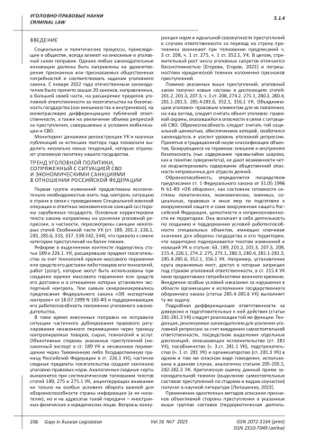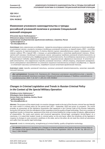 Цель заявленного исследования - провести мониторинг изменений, внесенных в текст российского уголовного закона и выявить основные тенденции уголовной политики за период апрель 2022 - сентябрь 2023 и оценить ее перспективность. В статье дается оценка законодательных новелл, появившихся в Уголовном кодексе РФ в период СВО, с позиции их целесообразности и качества юридической техники. Отмечается ряд знаковых тенденций в уголовном законе: расширение пределов уголовной ответственности за большое число посягательств, дифференциация ответственности. В исследовании применялись системный и структурный подходы; формально-юридический, социологический, формально-логический. В качестве вывода отмечается, что современные тренды уголовной политики с одной стороны, отражают своевременность реагирования законодателя на изменения социально-экономических условий в государстве, а с другой - не отвечают признаку системности, страдают низким качеством юридической техники.