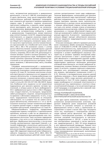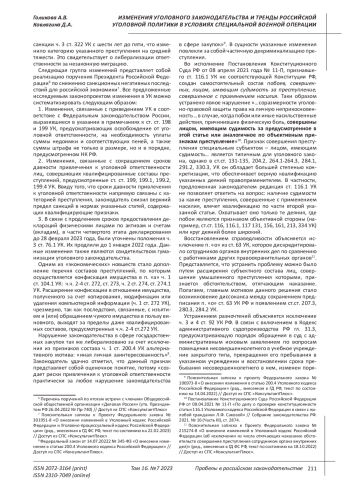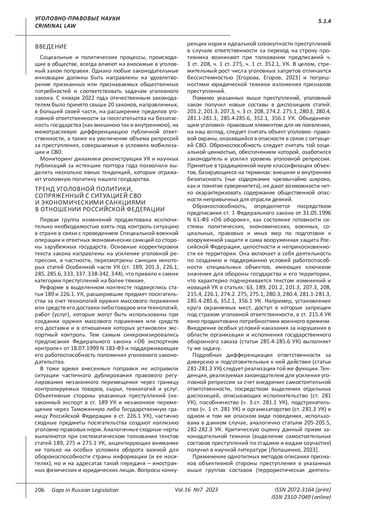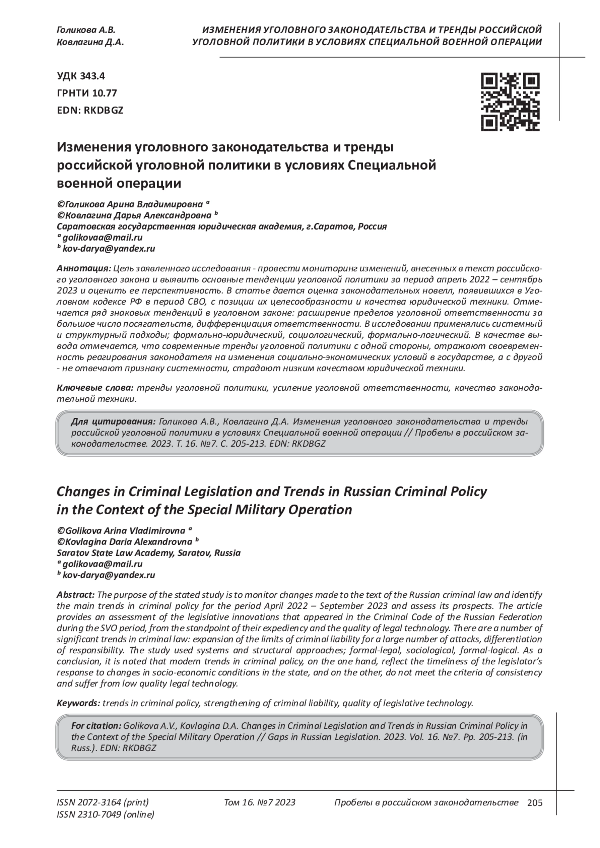 Lopashenko, N. A. Main results of reforming criminal legislation in 2022: analytical review / N. A. Lopashenko // Lex Russica (Russian Law). - 2023. - T. 76, No. 4(197). - pp. 115-135. DOI: 10.17803/1729-5920.2023.197.4.115-135 EDN: BJPGBV