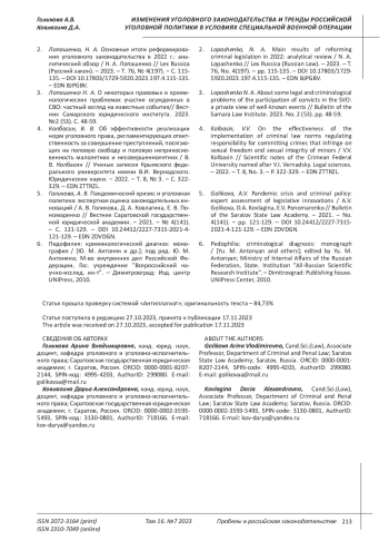 3. 	Лопашенко Н. А. О некоторых правовых и криминологических проблемах участия осужденных в СВО: частный взгляд на известные события// Вестник Самарского юридического института. 2023. №2 (53). С. 48-59. EDN: HTULOK ▼ Контекст