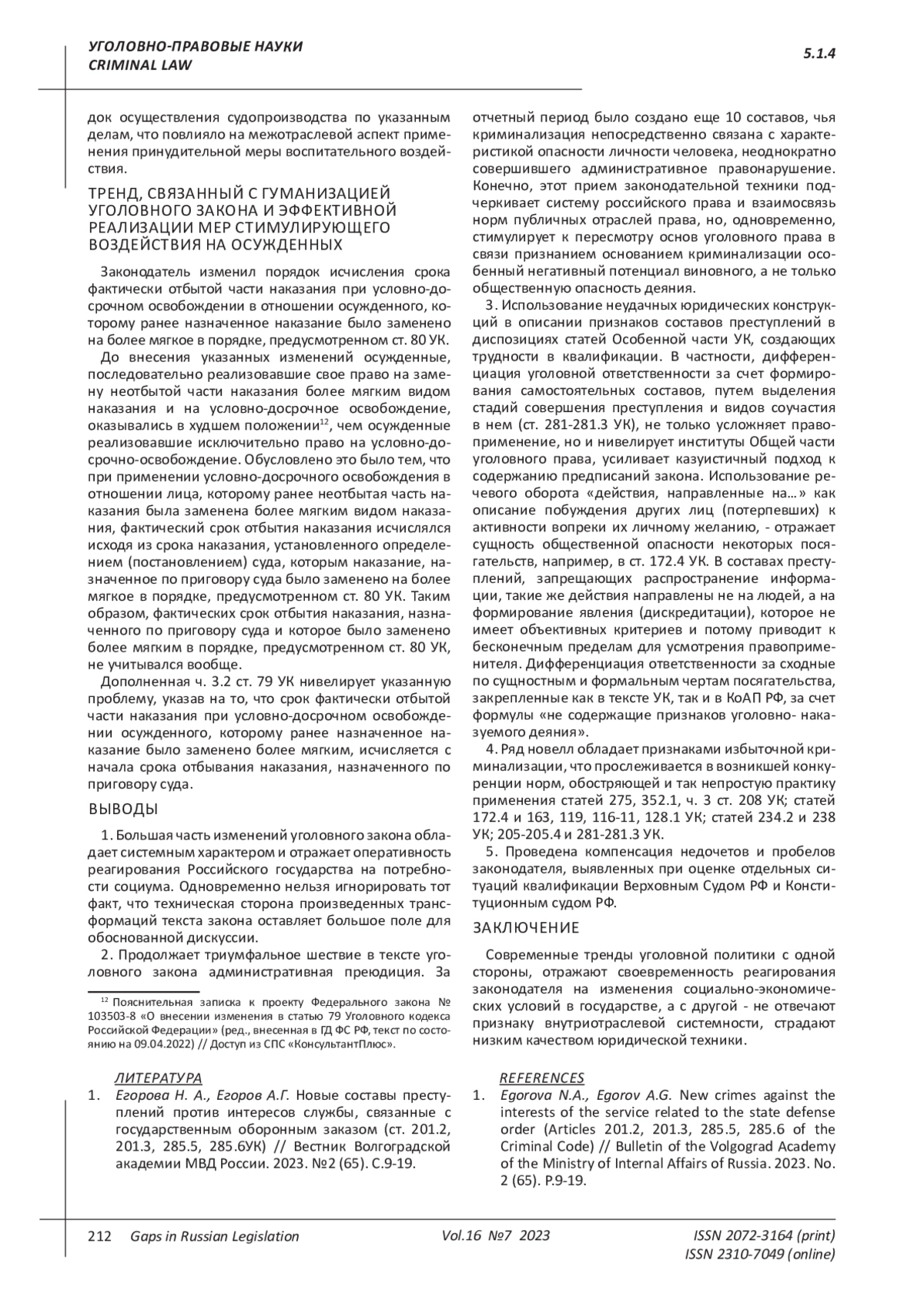 2. 	Лопашенко, Н. А. Основные итоги реформирования уголовного законодательства в 2022 г.: аналитический обзор / Н. А. Лопашенко // Lex Russica (Русский закон). - 2023. - Т. 76, № 4(197). - С. 115-135. DOI: 10.17803/1729-5920.2023.197.4.115-135 EDN: BJPGBV ▼ Контекст