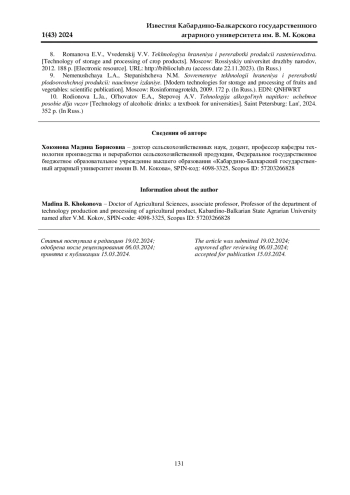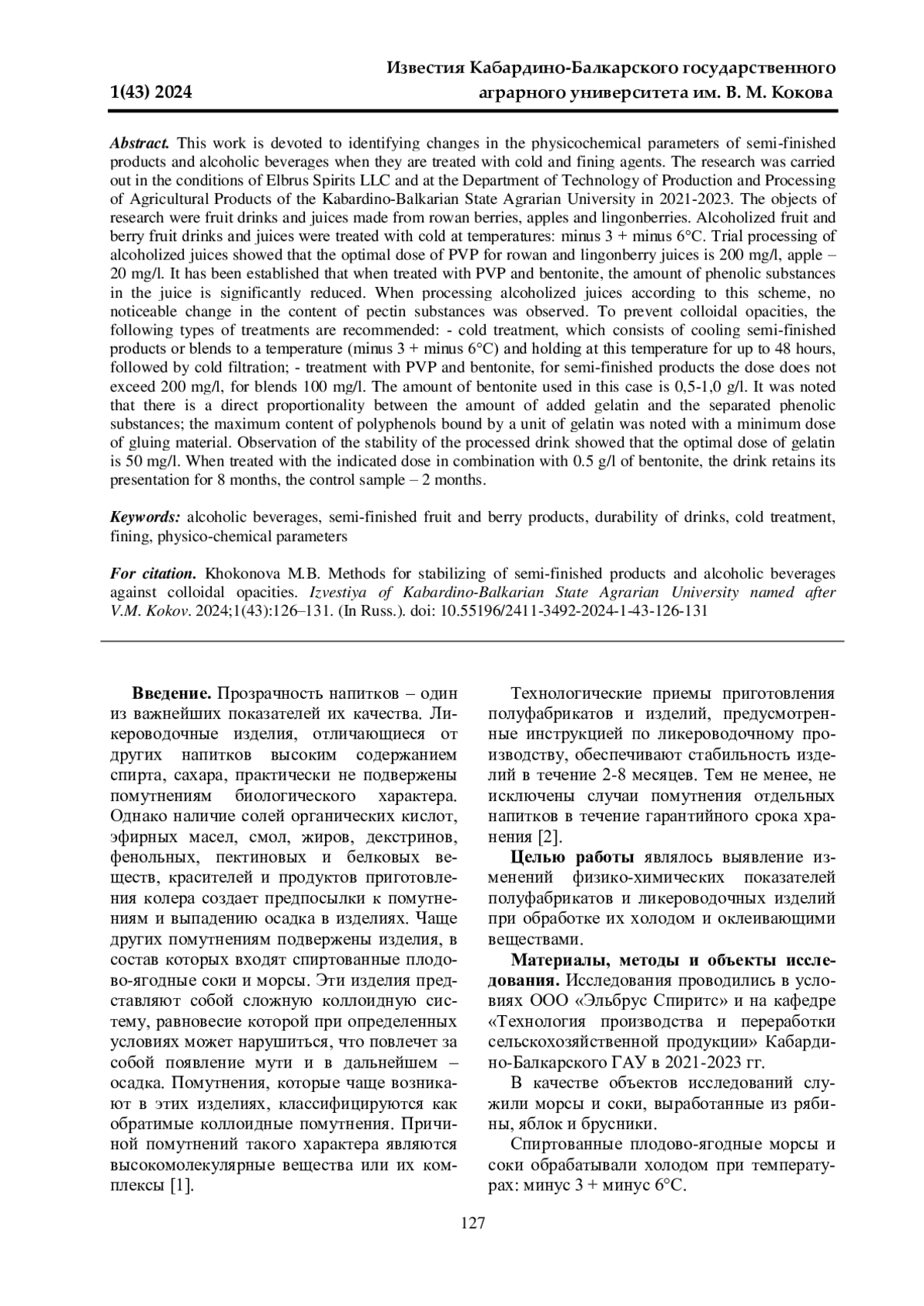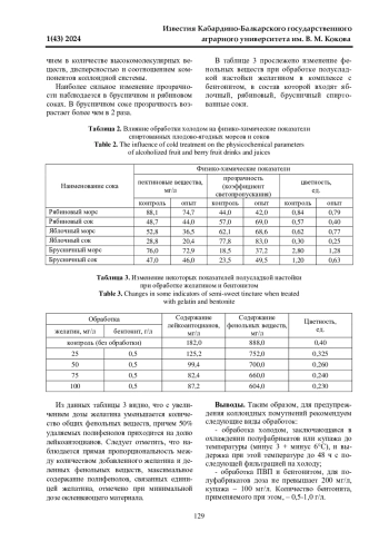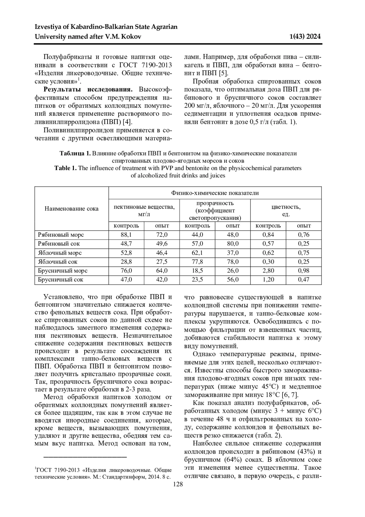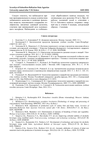 Данная работа посвящена выявлению изменений физико-химических показателей полуфабрикатов и ликероводочных изделий при обработке их холодом и оклеивающими веществами. Исследования проводились в условиях ООО «Эльбрус Спиритс» и на кафедре «Технология производства и переработки сельскохозяйственной продукции» Кабардино-Балкарского ГАУ в 2021-2023 гг. В качестве объектов исследований служили морсы и соки, выработанные из рябины, яблок и брусники. Спиртованные плодово-ягодные морсы и соки обрабатывали холодом при температурах: минус 3 + минус 6°С. Пробная обработка спиртованных соков показала, что оптимальная доза поливинилпирролидона (ПВП) для рябинового и брусничного соков составляет 200 мг/л, яблочного - 20 мг/л. Установлено, что при обработке ПВП и бентонитом значительно снижается количество фенольных веществ сока. При обработке спиртованных соков по данной схеме не наблюдалось заметного изменения содержания пектиновых веществ. Для предупреждения коллоидных помутнений рекомендованы следующие виды обработок: обработка холодом, заключающаяся в охлаждении полуфабрикатов или купажа до температуры (минус 3 + минус 6°С) и выдержка при этой температуре до 48 ч с последующей фильтрацией на холоду; обработка ПВП и бентонитом, для полуфабрикатов доза не превышает 200 мг/л, купажа - 100 мг/л. Количество бентонита, применяемого при этом, - 0,5-1,0 г/л. Отмечено, что наблюдается прямая пропорциональность между количеством добавленного желатина и деленных фенольных веществ, максимальное содержание полифенолов, связанных единицей желатина, при минимальной дозе оклеивающего материала. Наблюдение за стабильностью обработанного напитка показало, что оптимальная доза желатина 50 мг/л. При обработке указанной дозой в сочетании с 0,5 г/л бентонита напиток сохраняет товарный вид в течение 8 месяцев, контрольный образец - 2 месяцев.