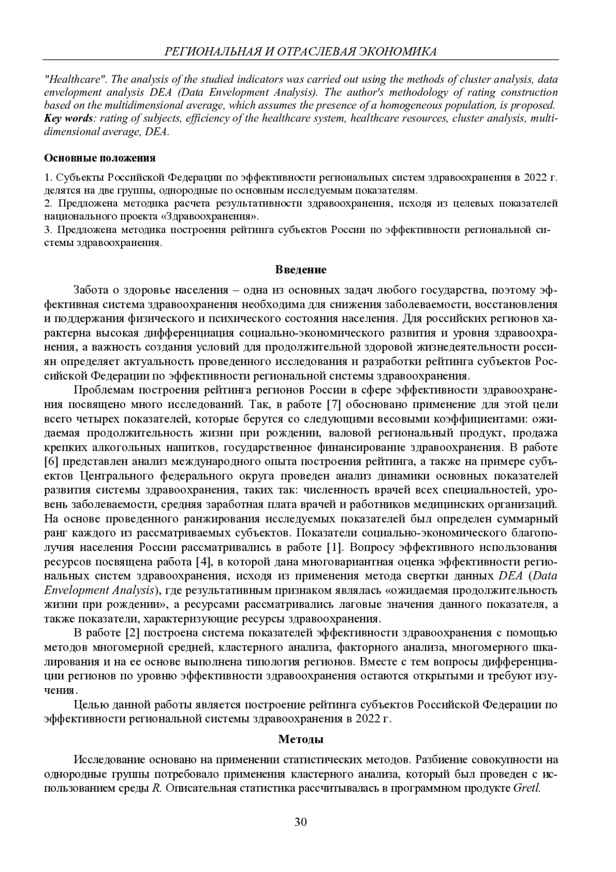 Ключевые фразы: рейтинг субъектов, эффективность системы здравоохранения, ресурсы здравоохранения, кластерный анализ, многомерная средняя, dea