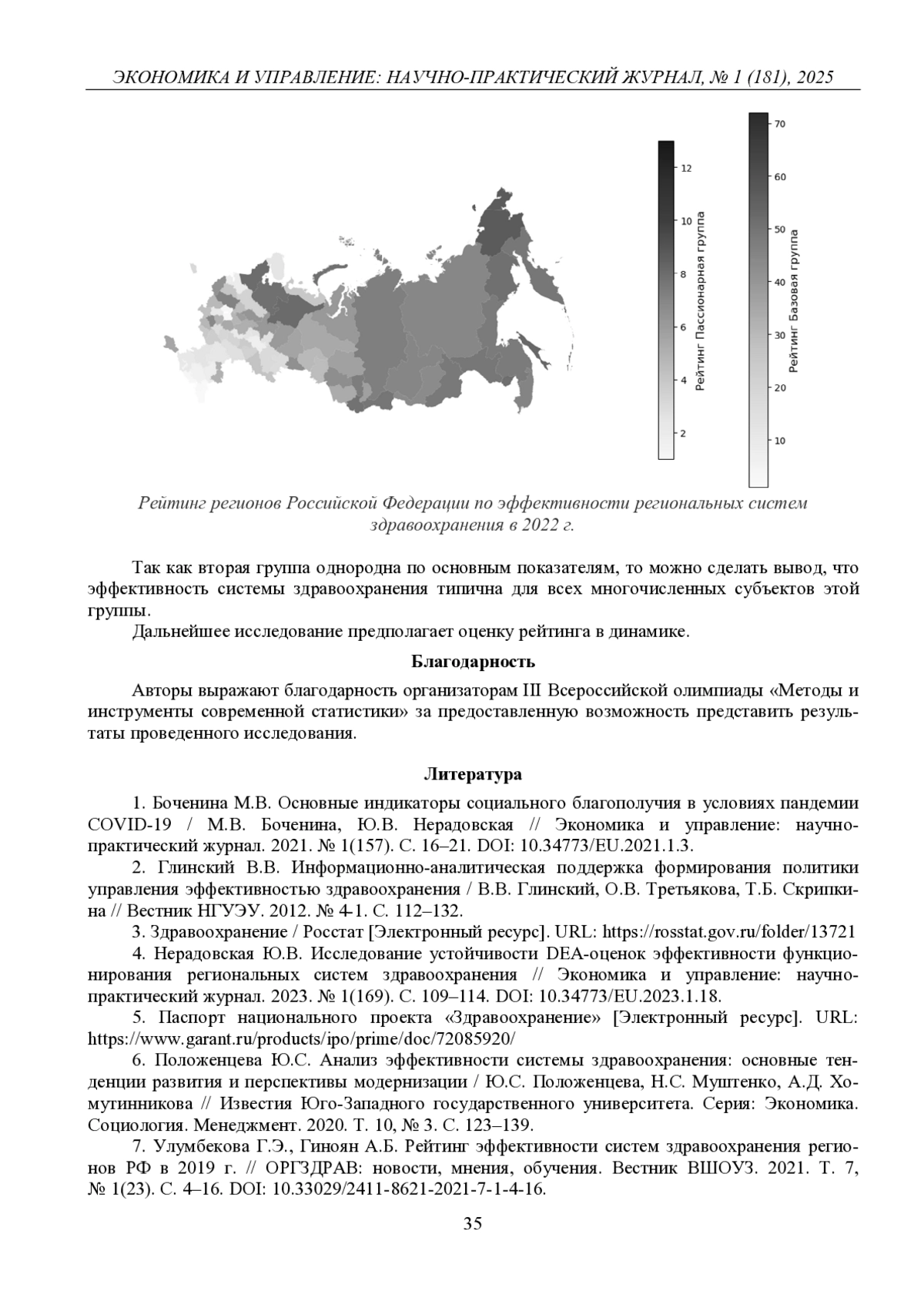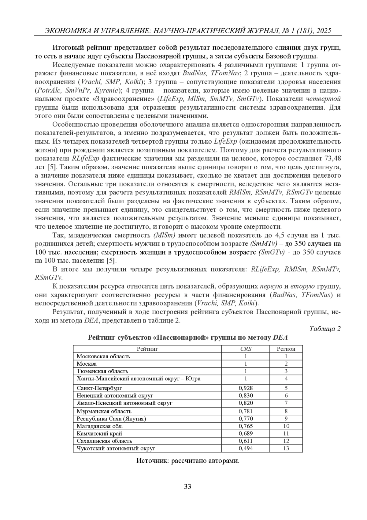 БОЧЕНИНА М. В., КУРГИНА С. М., МУЗАЛЕВСКАЯ С. А., ЯНГИРОВ Т. А. ЭФФЕКТИВНОСТЬ РЕГИОНАЛЬНОЙ СИСТЕМЫ ЗДРАВООХРАНЕНИЯ: РЕЙТИНГ СУБЪЕКТОВ РОССИЙСКОЙ ФЕДЕРАЦИИ // ЭКОНОМИКА И УПРАВЛЕНИЕ: НАУЧНО-ПРАКТИЧЕСКИЙ ЖУРНАЛ. 2025. № 1 (181)