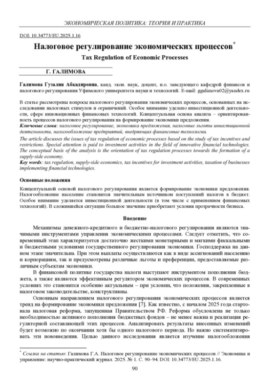 В статье рассмотрены вопросы налогового регулирования экономических процессов, основанных на исследовании налоговых стимулов и ограничений. Особое внимание уделено инвестиционной деятельности, сфере инновационных финансовых технологий. Концептуальная основа анализа – ориентированность процессов налогового регулирования на формирование экономики предложения