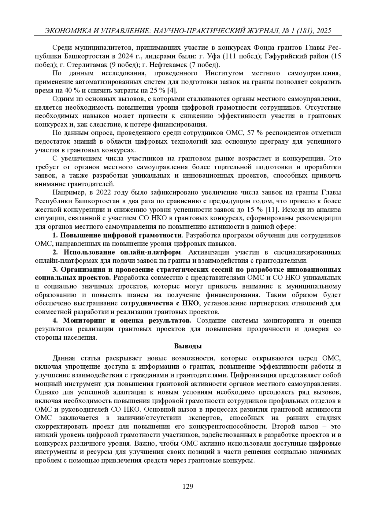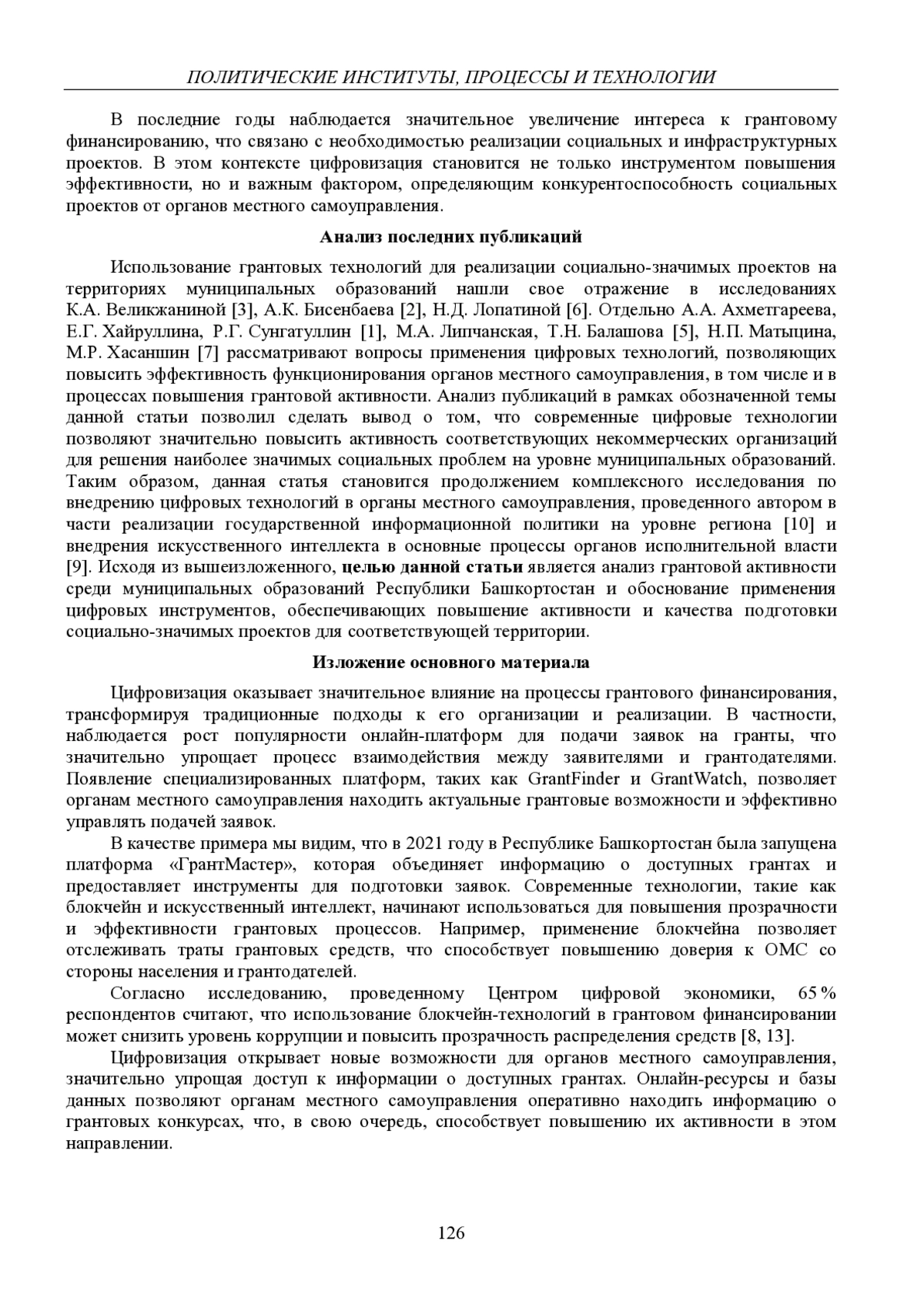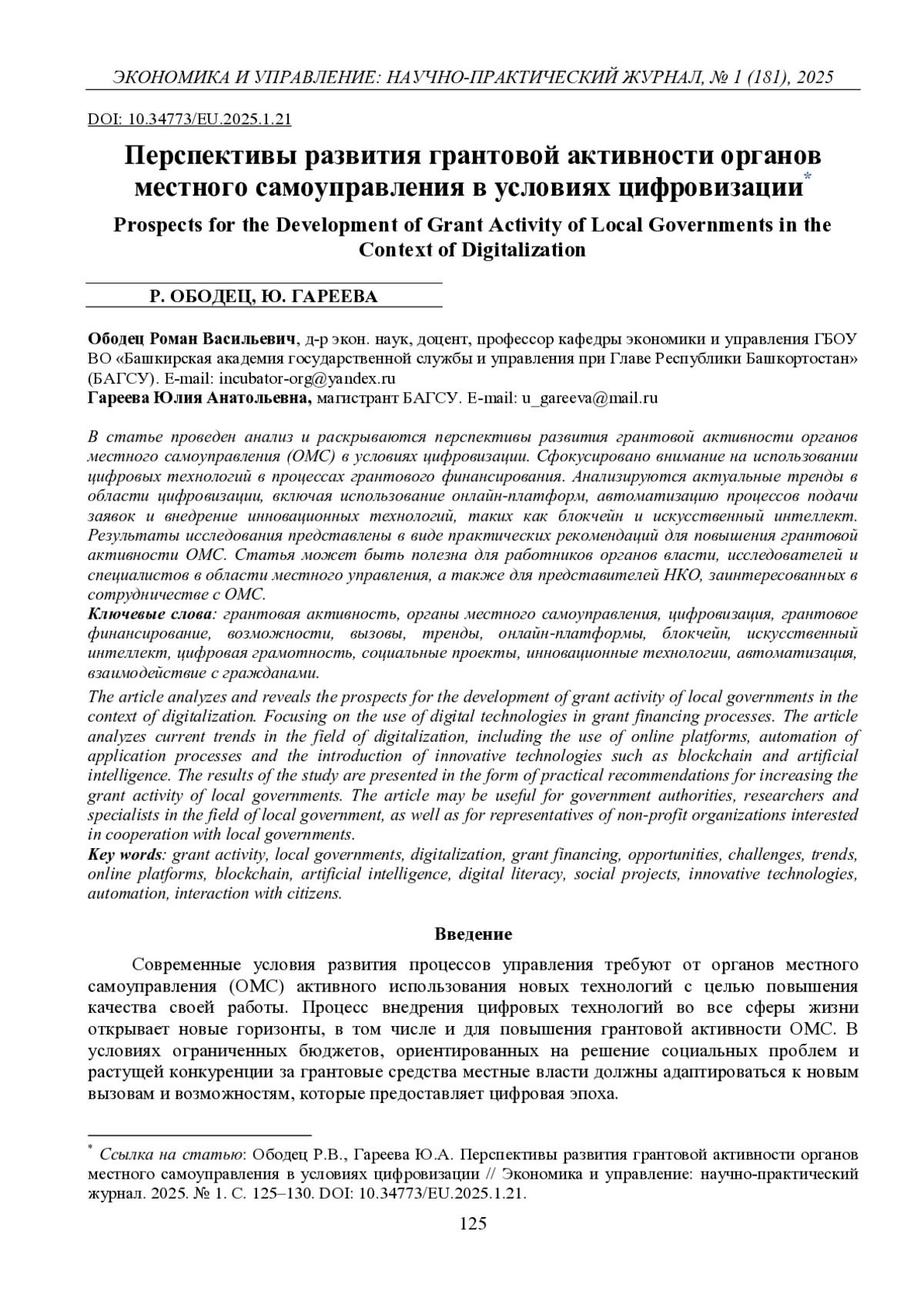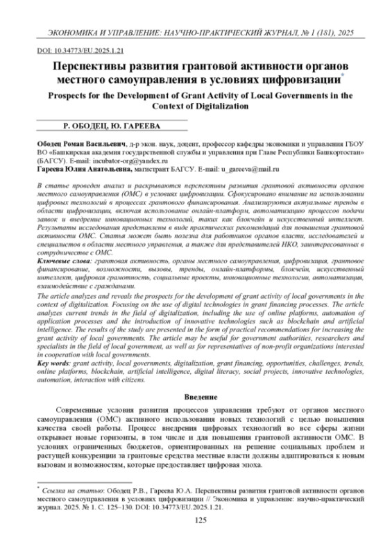 Современные условия развития процессов управления требуют от органов местного самоуправления (ОМС) активного использования новых технологий с целью повышения качества своей работы. Процесс внедрения цифровых технологий во все сферы жизни открывает новые горизонты, в том числе и для повышения грантовой активности ОМС. В условиях ограниченных бюджетов, ориентированных на решение социальных проблем и растущей конкуренции за грантовые средства местные власти должны адаптироваться к новым вызовам и возможностям, которые предоставляет цифровая эпоха