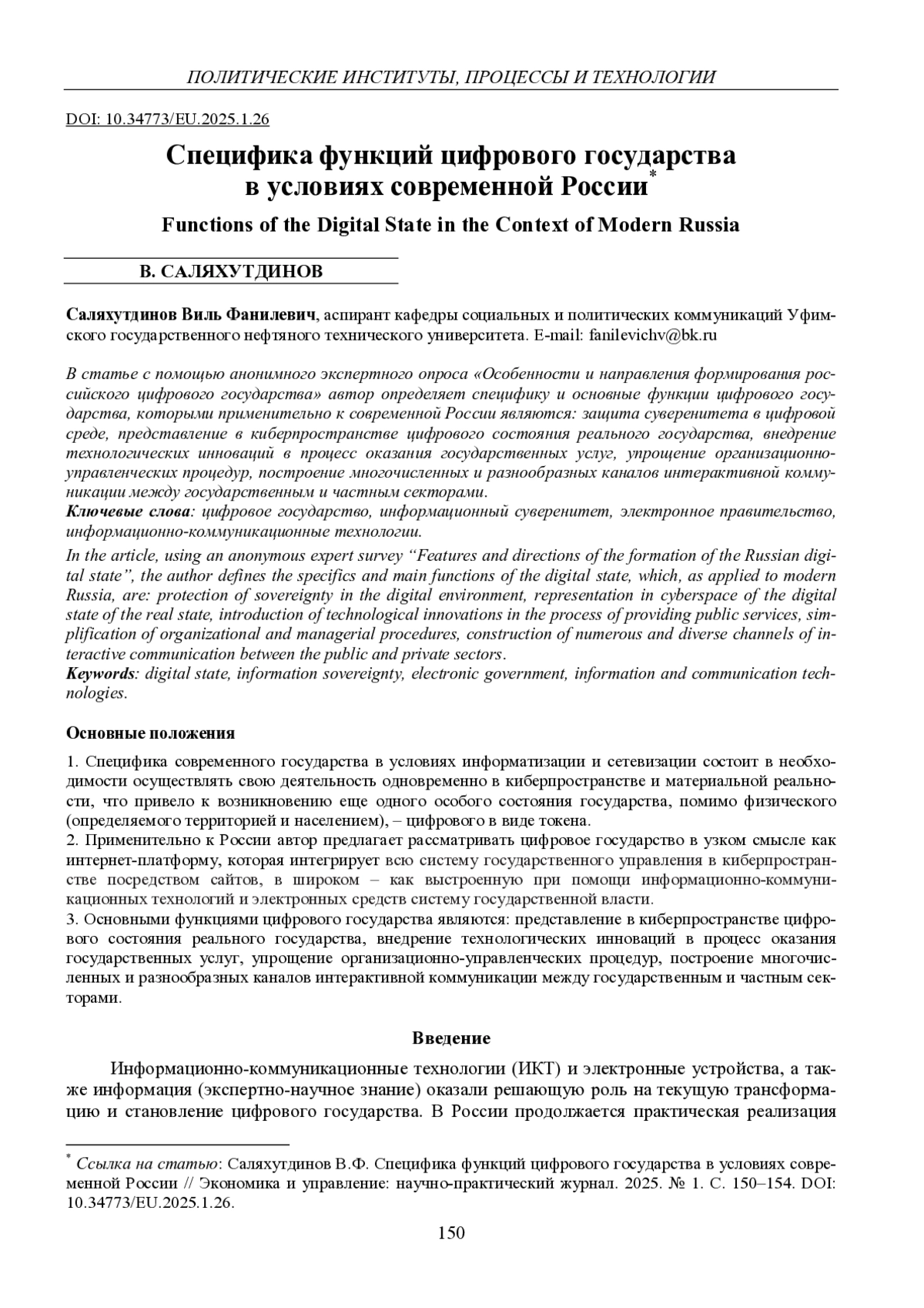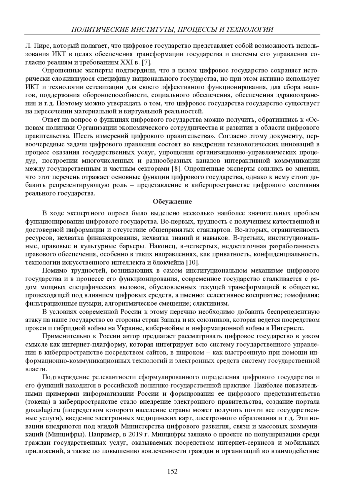 В статье с помощью анонимного экспертного опроса «Особенности и направления формирования российского цифрового государства» автор определяет специфику и основные функции цифрового государства, которыми применительно к современной России являются: защита суверенитета в цифровой среде, представление в киберпространстве цифрового состояния реального государства, внедрение технологических инноваций в процесс оказания государственных услуг, упрощение организационноуправленческих процедур, построение многочисленных и разнообразных каналов интерактивной коммуникации между государственным и частным секторами