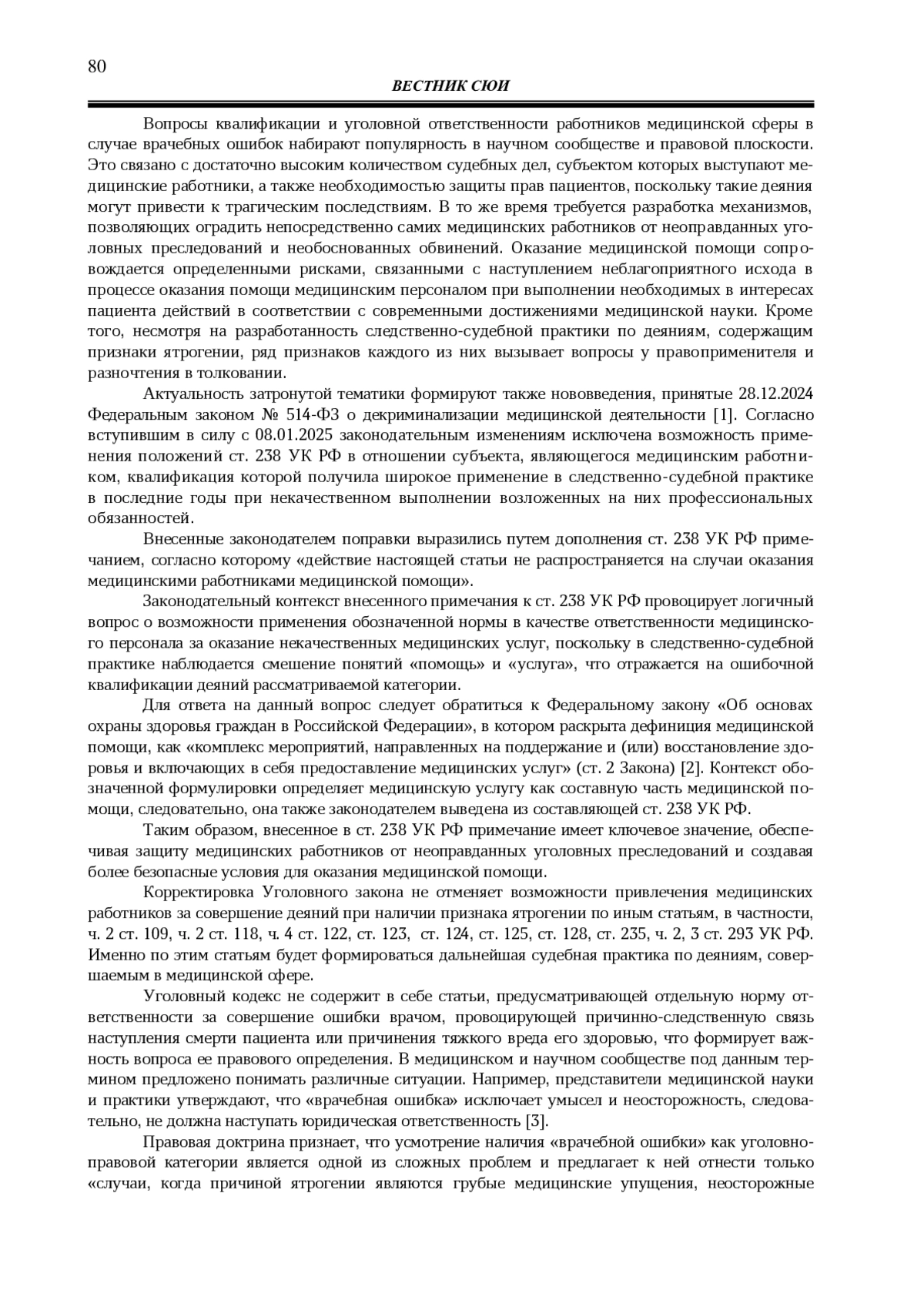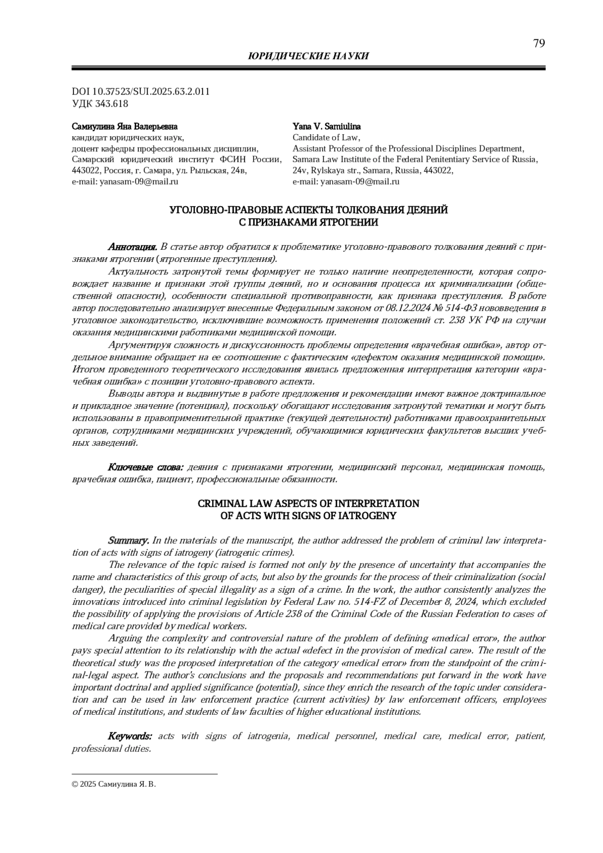 САМИУЛИНА Я. В. УГОЛОВНО-ПРАВОВЫЕ АСПЕКТЫ ТОЛКОВАНИЯ ДЕЯНИЙ С ПРИЗНАКАМИ ЯТРОГЕНИИ // ВЕСТНИК САМАРСКОГО ЮРИДИЧЕСКОГО ИНСТИТУТА. 2025. № 2 (63)