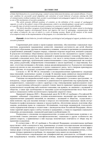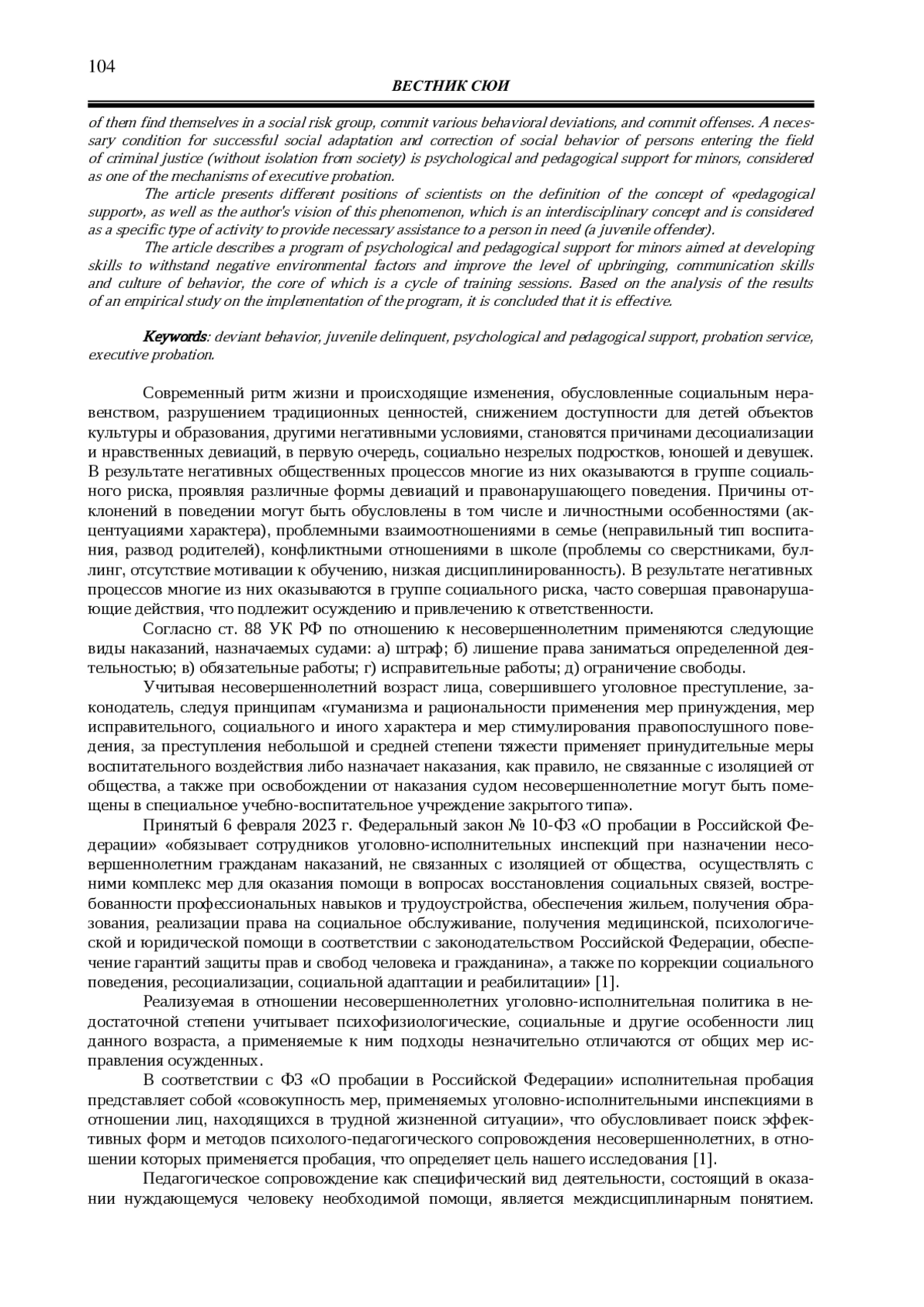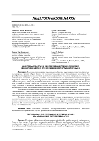 В результате парадоксов современной жизни многие из них оказываются в группе социального риска, допускают различные девиации в поведении, совершают правонарушения. Необходимым условием успешной социальной адаптации и коррекции социального поведения лиц, попадающих в сферу уголовной юстиции (без изоляции от общества), является психолого-педагогическое сопровождение несовершеннолетних, рассматриваемое как один из механизмов исполнительной пробации.